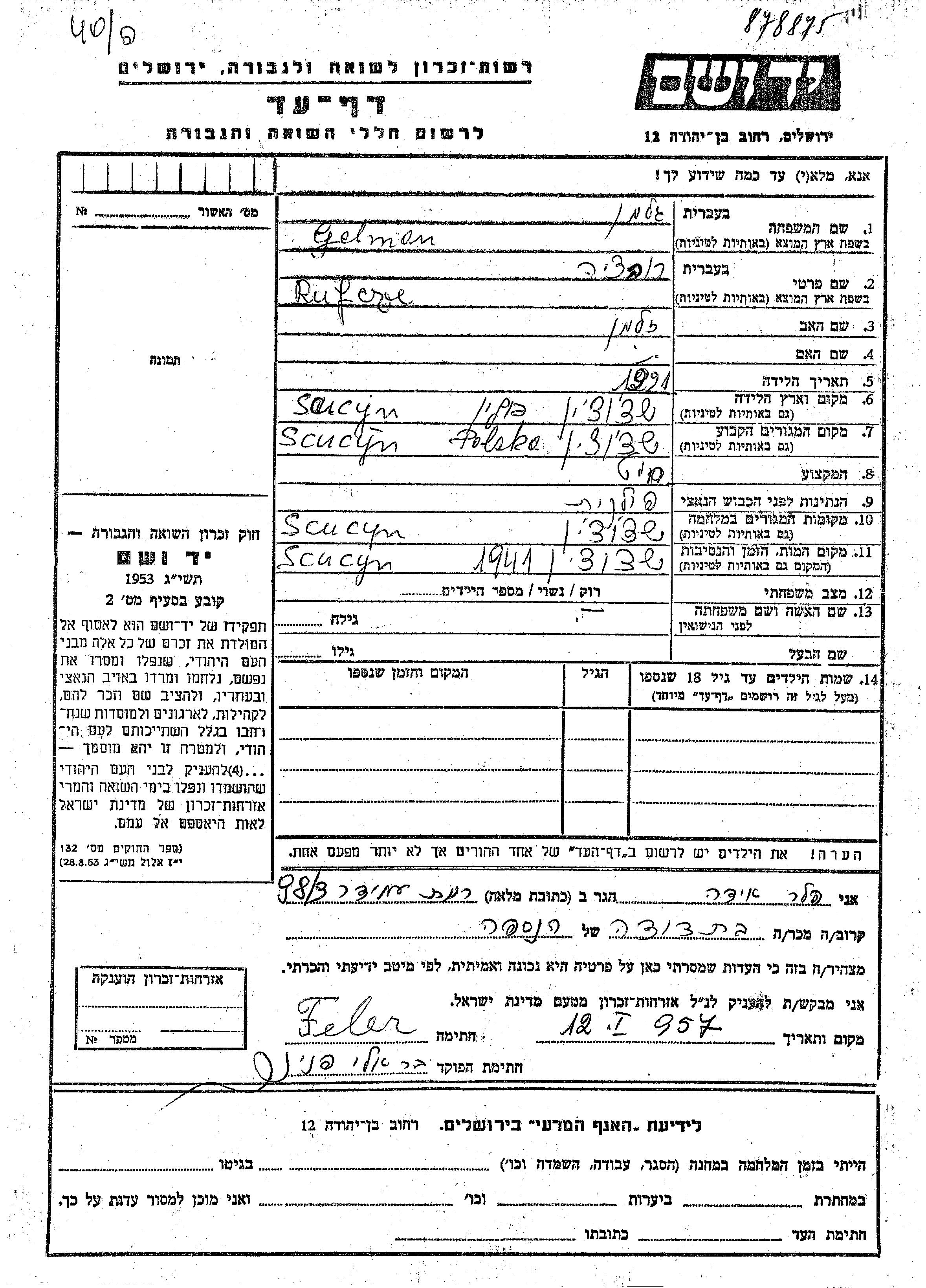Rufcze Ruvtzia Gelman wurde im Jahr 1921 in Szczuczyn, Polen geboren. Sie war die Tochter von Zalman. Sie war Schneider und Ledig. Vor dem Zweiten Weltkrieg lebte sie in Szczuczyn, Polen. Während des Krieges war sie in Szczuczyn, Polen.