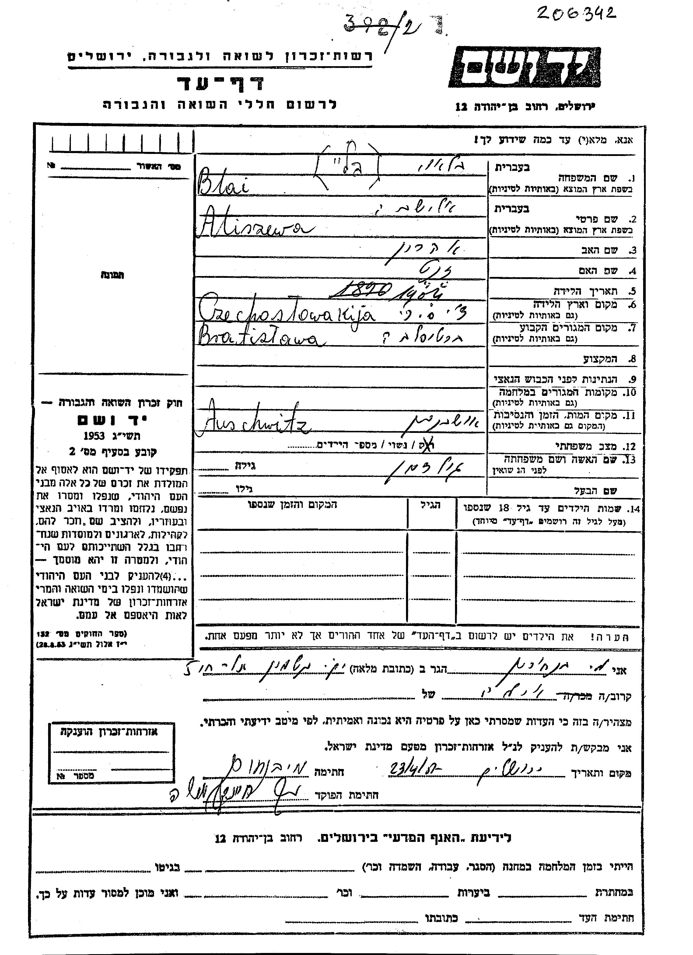 Aliszewa Blai, geb. Goldman wurde im Jahr 1904 in Tschechoslowakei geboren. Sie war die Tochter von Aharon und Zhanet. Sie war Verheiratet. Vor dem Zweiten Weltkrieg lebte sie in Bratislava, Tschechoslowakei.