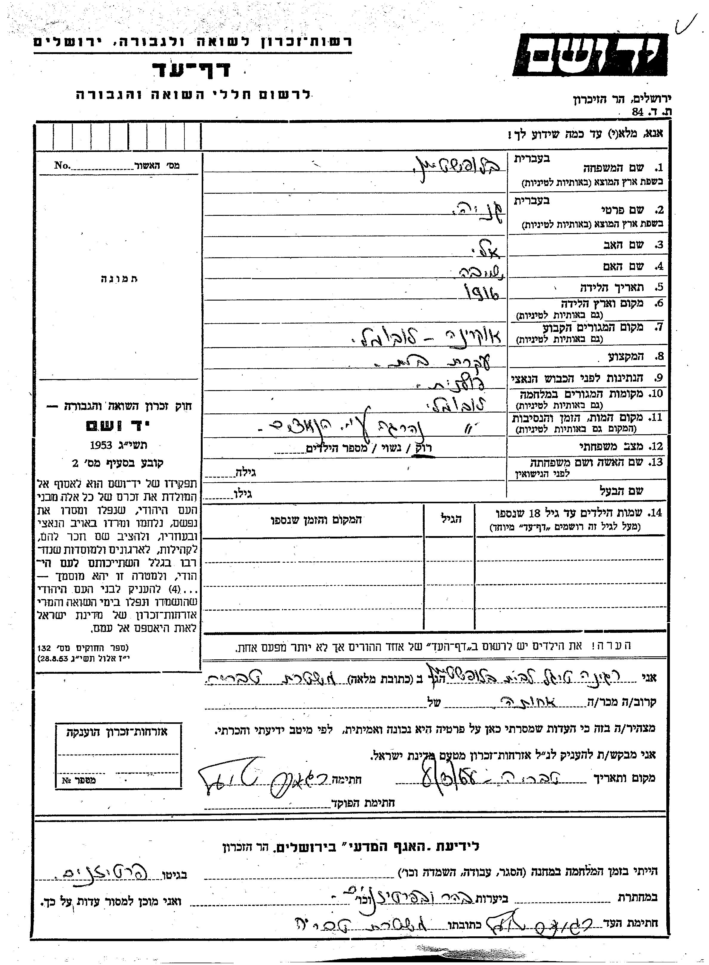 Genya Blofshtein wurde im Jahr 1916 geboren. Sie war die Tochter von Eli und Sheiva. Sie war Hausfrau und Ledig. Vor dem Zweiten Weltkrieg lebte sie in Luboml, Polen. Während des Krieges war sie in Luboml, Polen.