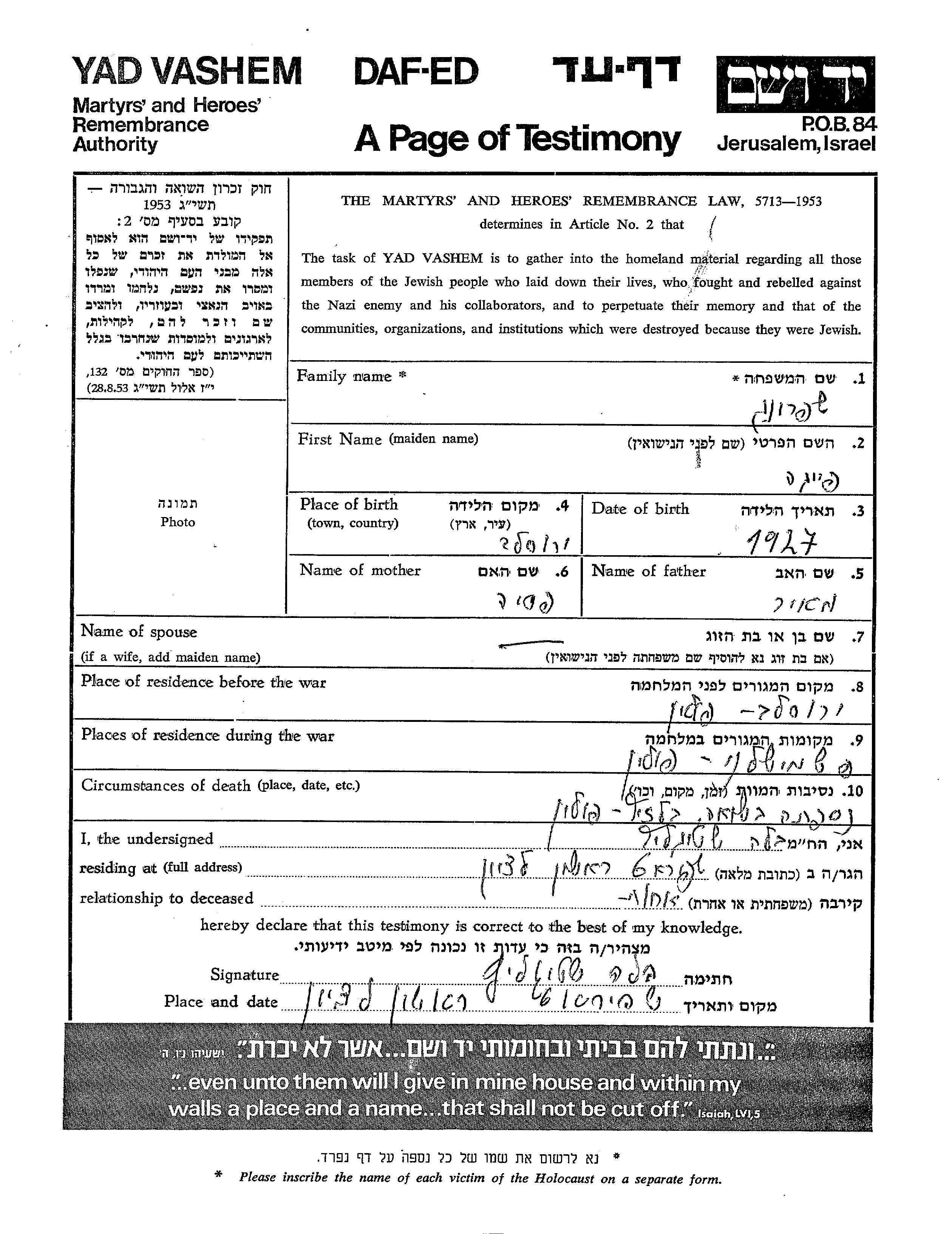 Feiga Shpring wurde im Jahr 1927 in Jeroslaw, Polen geboren. Sie war die Tochter von Meir und Pesia. Vor dem Zweiten Weltkrieg lebte sie in Jeroslaw, Polen. Während des Krieges war sie in Przemyslany, Polen.