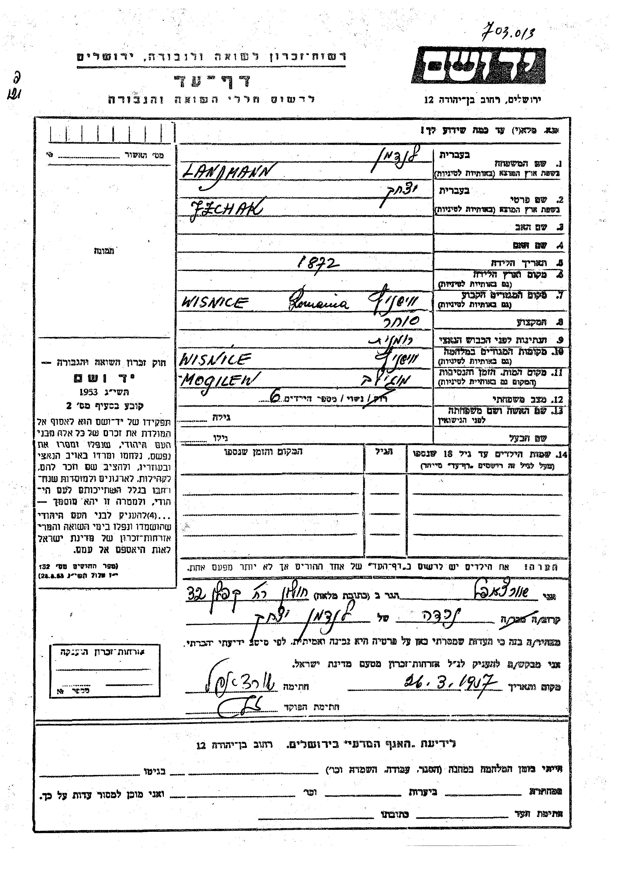 Izchak wurde in der Schoah ermordet. Todesort: Mogilev Podolski, Ukraine (UdSSR).