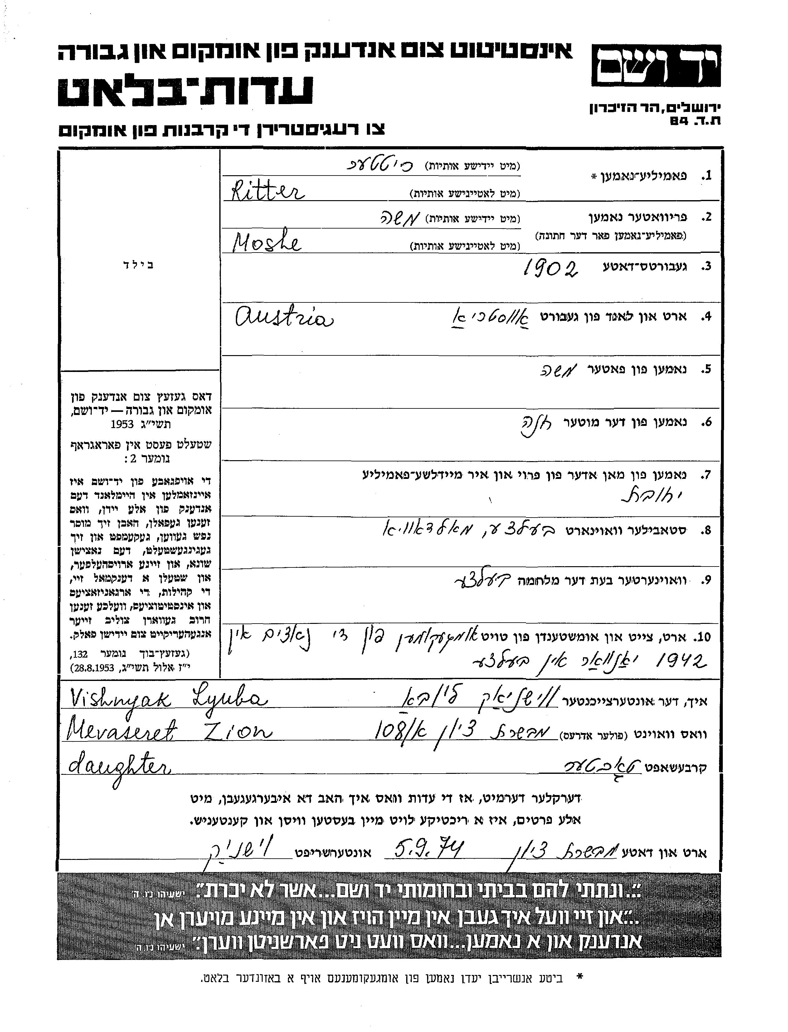 Moshe Ritter wurde im Jahr 1902 in Österreich geboren. Er war der Sohn von Moshe und Khana. Vor dem Zweiten Weltkrieg lebte er in Beltsy, Rumänien. Während des Krieges war er in Beltsy, Rumänien.