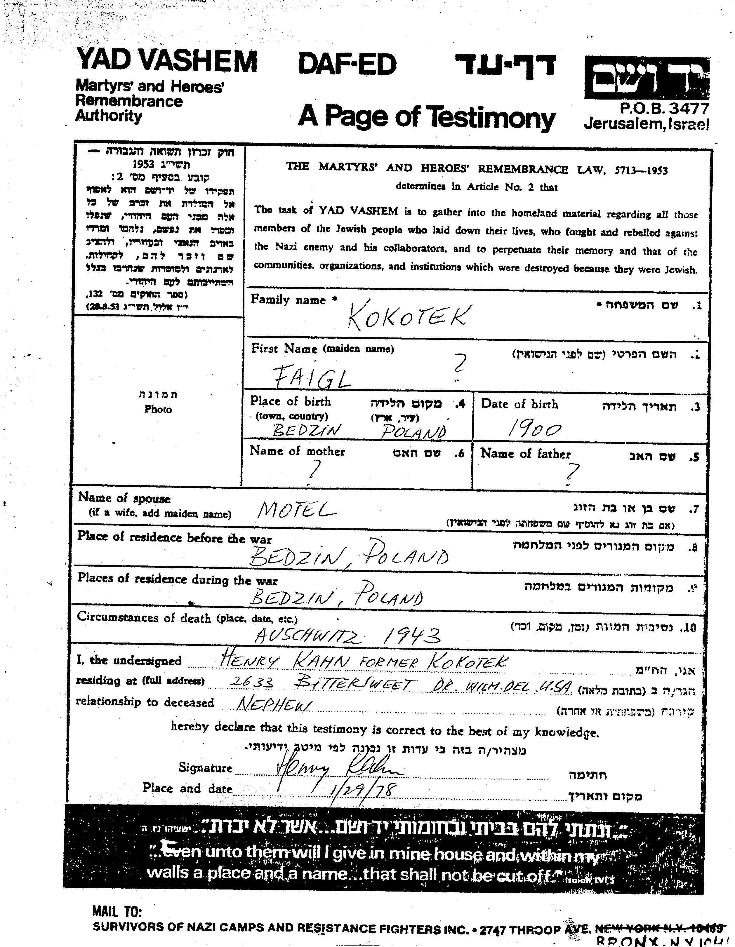 Faigl Kokotek wurde im Jahr 1900 in Będzin, Polen geboren. Sie war mit Motel Verheiratet. Vor dem Zweiten Weltkrieg lebte sie in Będzin, Polen. Während des Krieges war sie in Będzin, Polen.