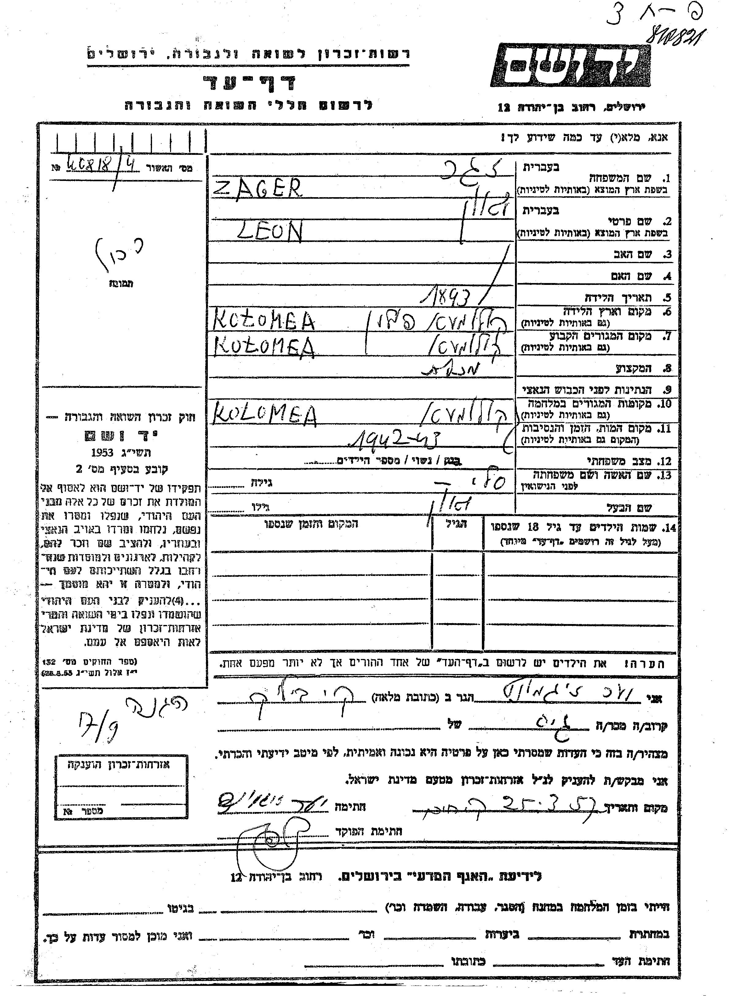 Leon Zager wurde im Jahr 1893 in Kolomyja, Polen geboren. Er war mit Sali Verheiratet. Vor dem Zweiten Weltkrieg lebte er in Kolomyja, Polen. Während des Krieges war er in Kolomyja, Polen.