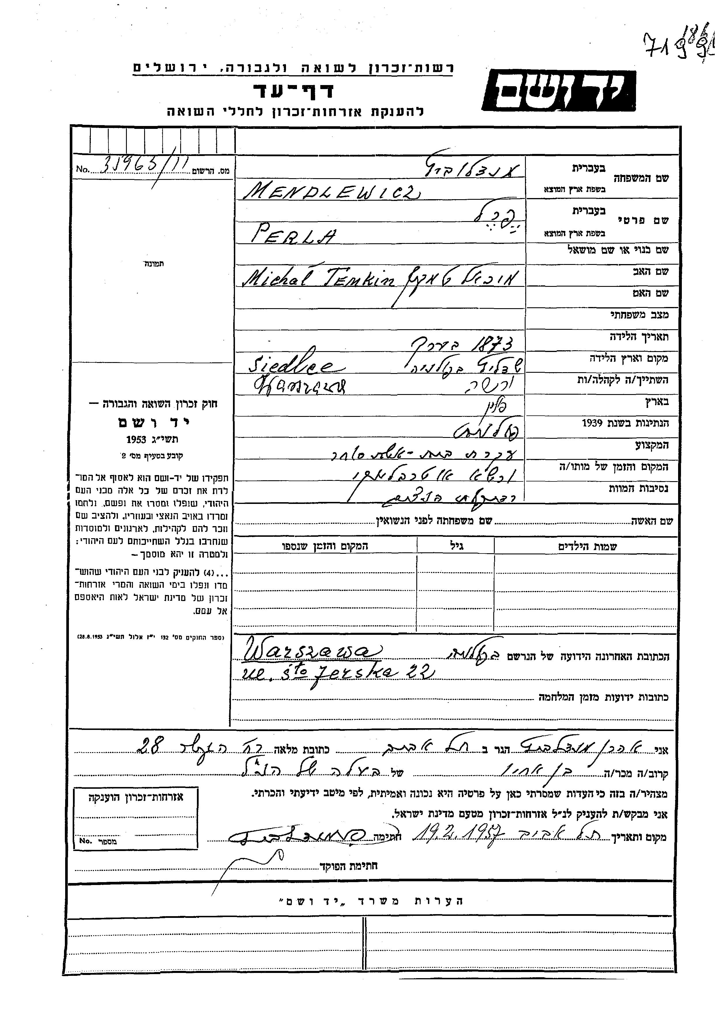 Perla Mendlewicz, geb. Temkin wurde im Jahr 1873 in Siedlce, Polen geboren. Sie war die Tochter von Michal. Sie war Hausfrau. Vor dem Zweiten Weltkrieg lebte sie in Warszawa, Polen. Während des Krieges war sie in Warszawa, Polen.
