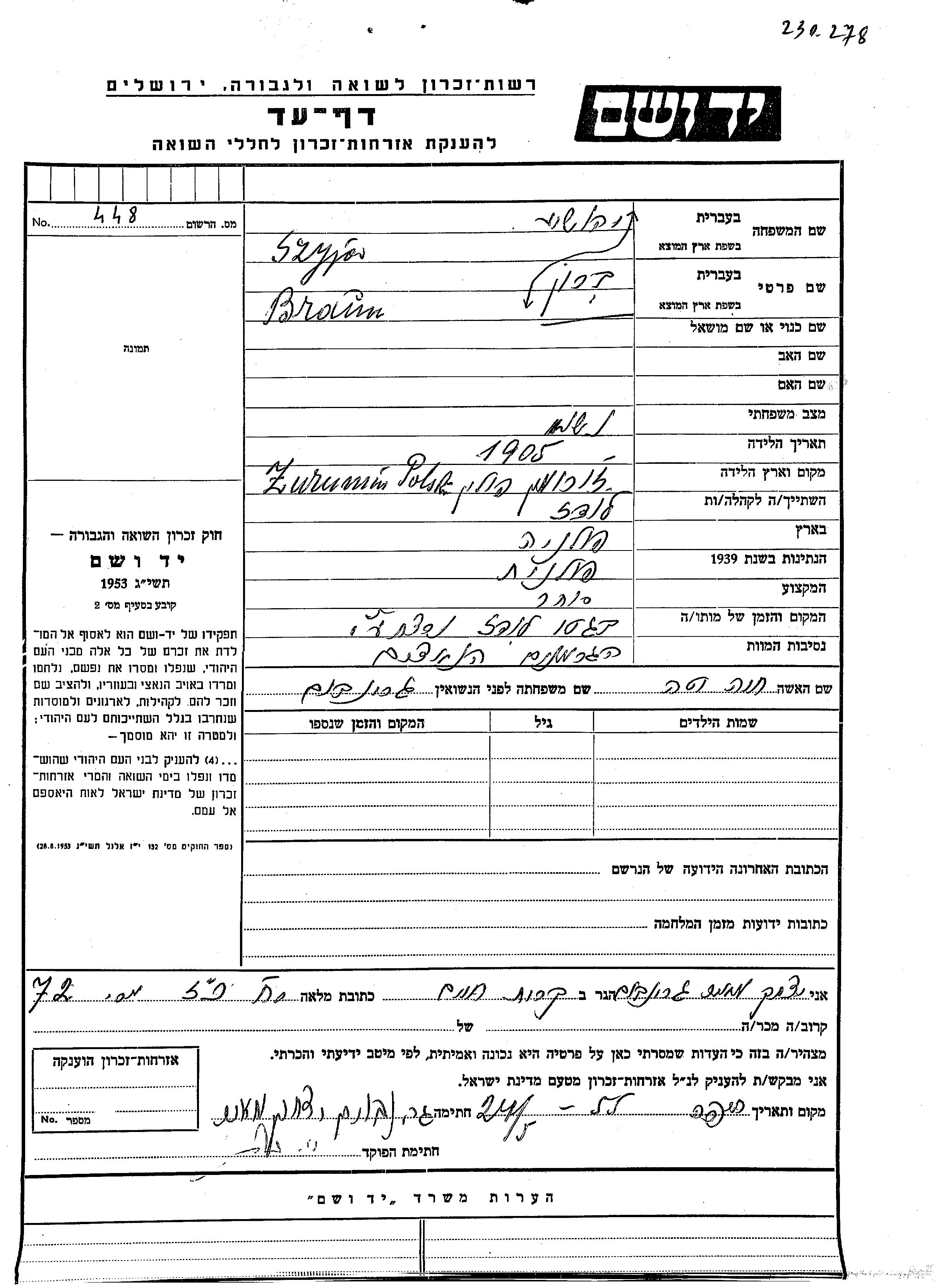 Szyju Brown Brun wurde im Jahr 1905 in Zuramien, Polen geboren. Er war Kaufmann/-frau und mit Khava Yeta, geb. Grinbom Verheiratet. Vor dem Zweiten Weltkrieg lebte er in Lodz, Polen. Während des Krieges war er in Lodz, Polen.