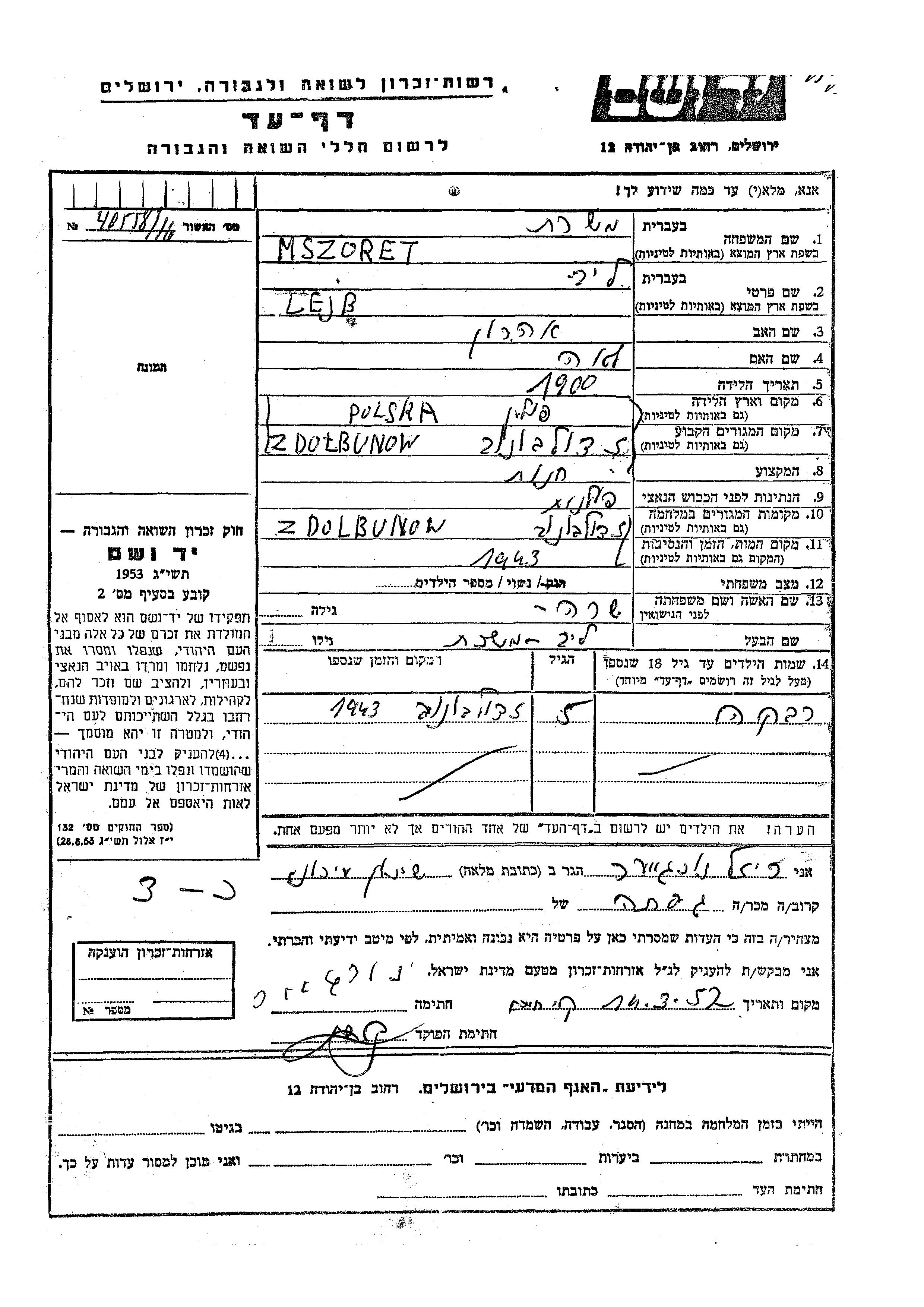 Lejb Mszoret wurde im Jahr 1900 in Zdolbunow, Polen geboren. Er war der Sohn von Aharon und Lea. Er war mit Sara Verheiratet. Vor dem Zweiten Weltkrieg lebte er in Zdolbunow, Polen. Während des Krieges war er in Zdolbunow, Polen.