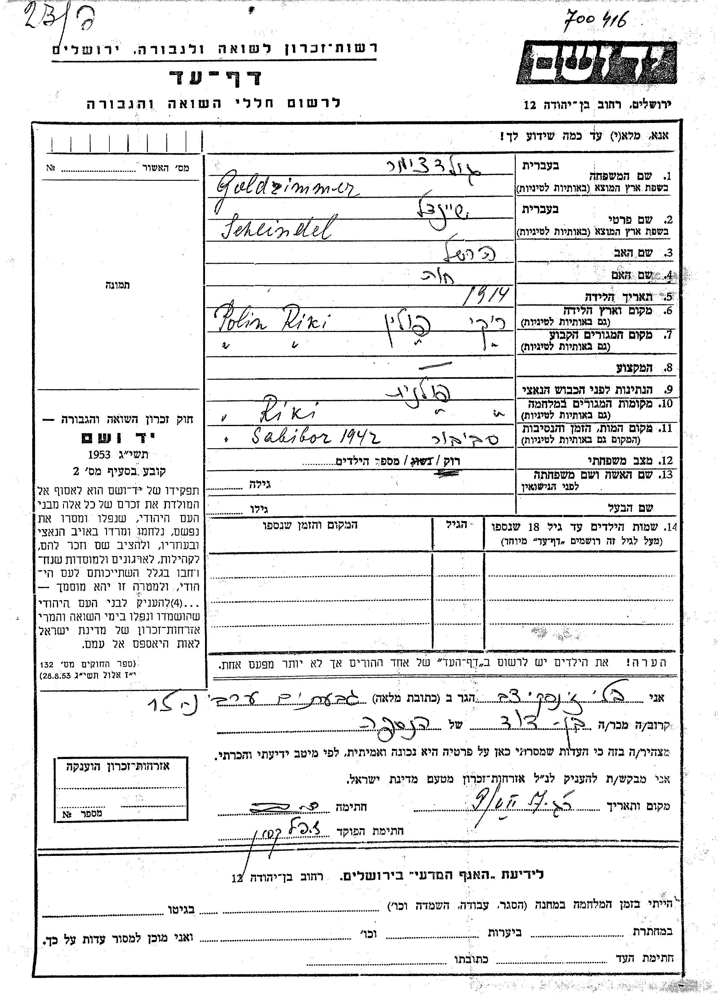 Scheindel Goldzimmer wurde im Jahr 1914 in Riki, Polen geboren. Sie war die Tochter von Hershel und Khava. Sie war Ledig. Vor dem Zweiten Weltkrieg lebte sie in Riki, Polen. Während des Krieges war sie in Riki, Polen.