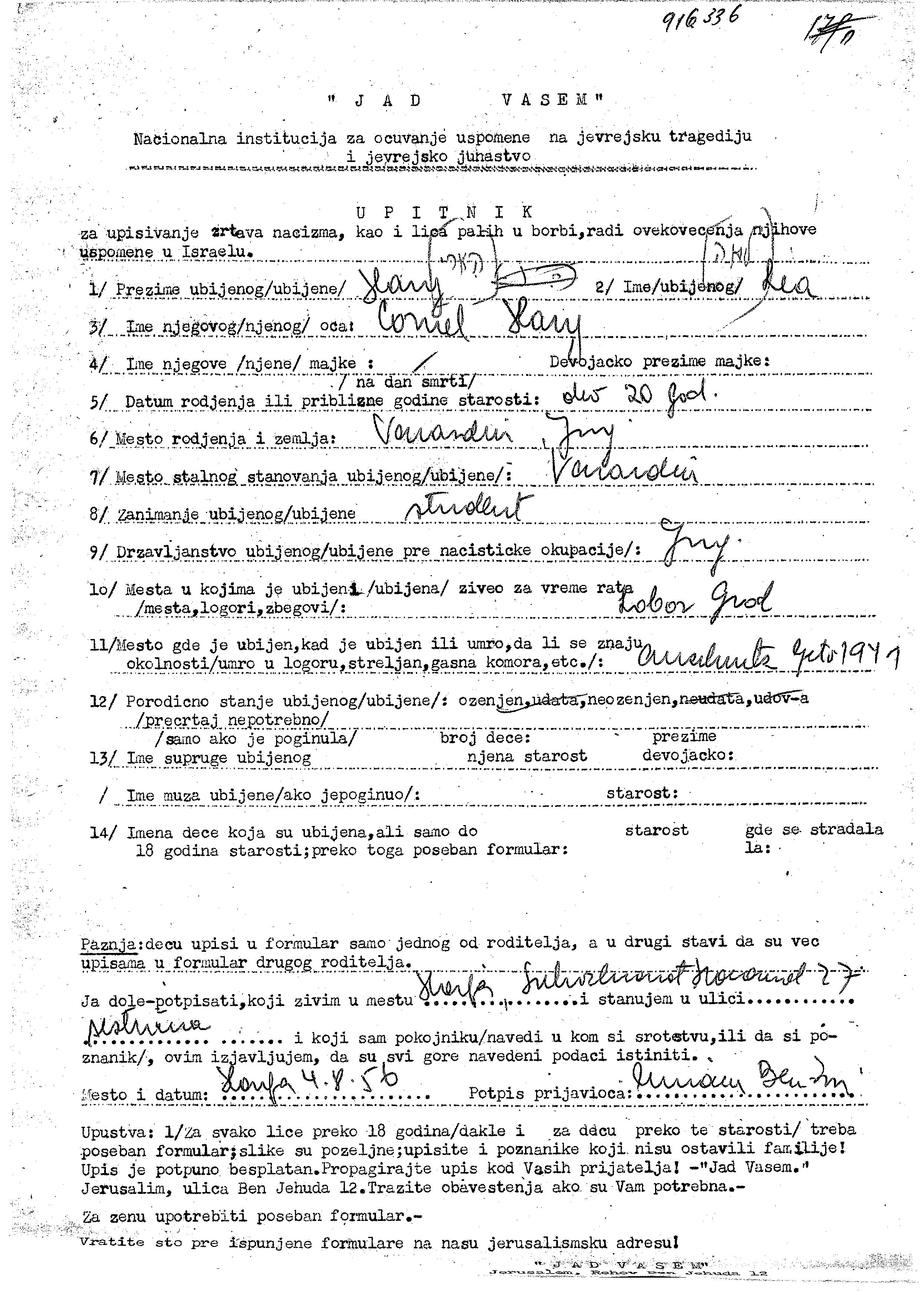 Lea Hary wurde in Varazdin, Jugoslawien geboren. Sie war die Tochter von Cornel. Sie war Student und Ledig. Vor dem Zweiten Weltkrieg lebte sie in Varazdin, Jugoslawien. Während des Krieges war sie in Loborgrad, Jugoslawien.
