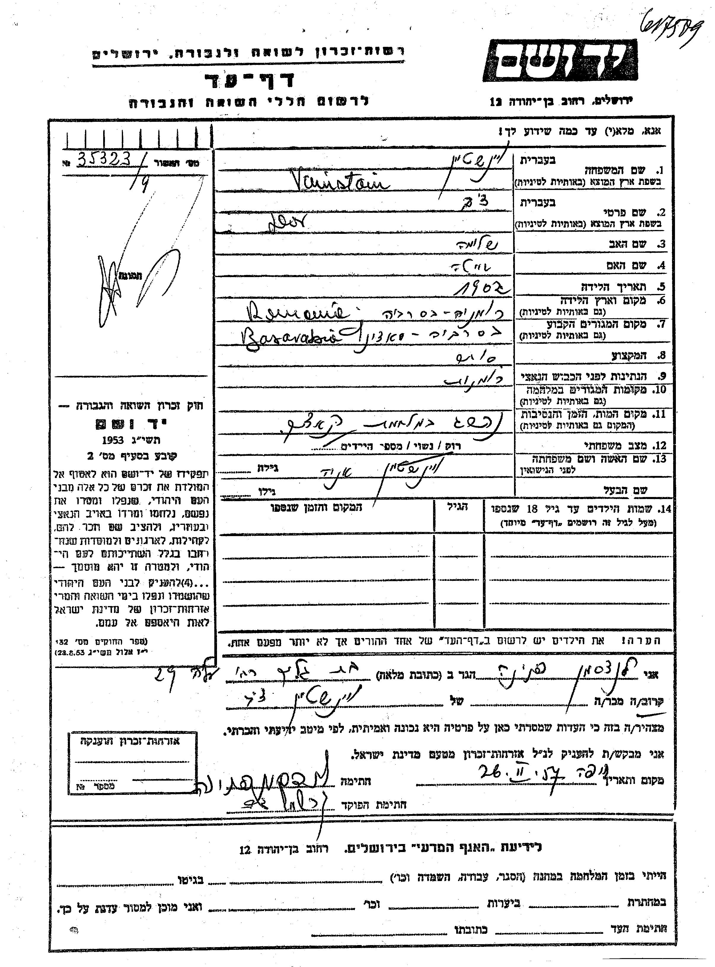 Dov Vainstain wurde im Jahr 1902 in Bessarabia, Rumänien geboren. Er war der Sohn von Shlomo und Beila. Er war Kaufmann/-frau und mit Ana Verheiratet. Vor dem Zweiten Weltkrieg lebte er in Yedinec, Rumänien.