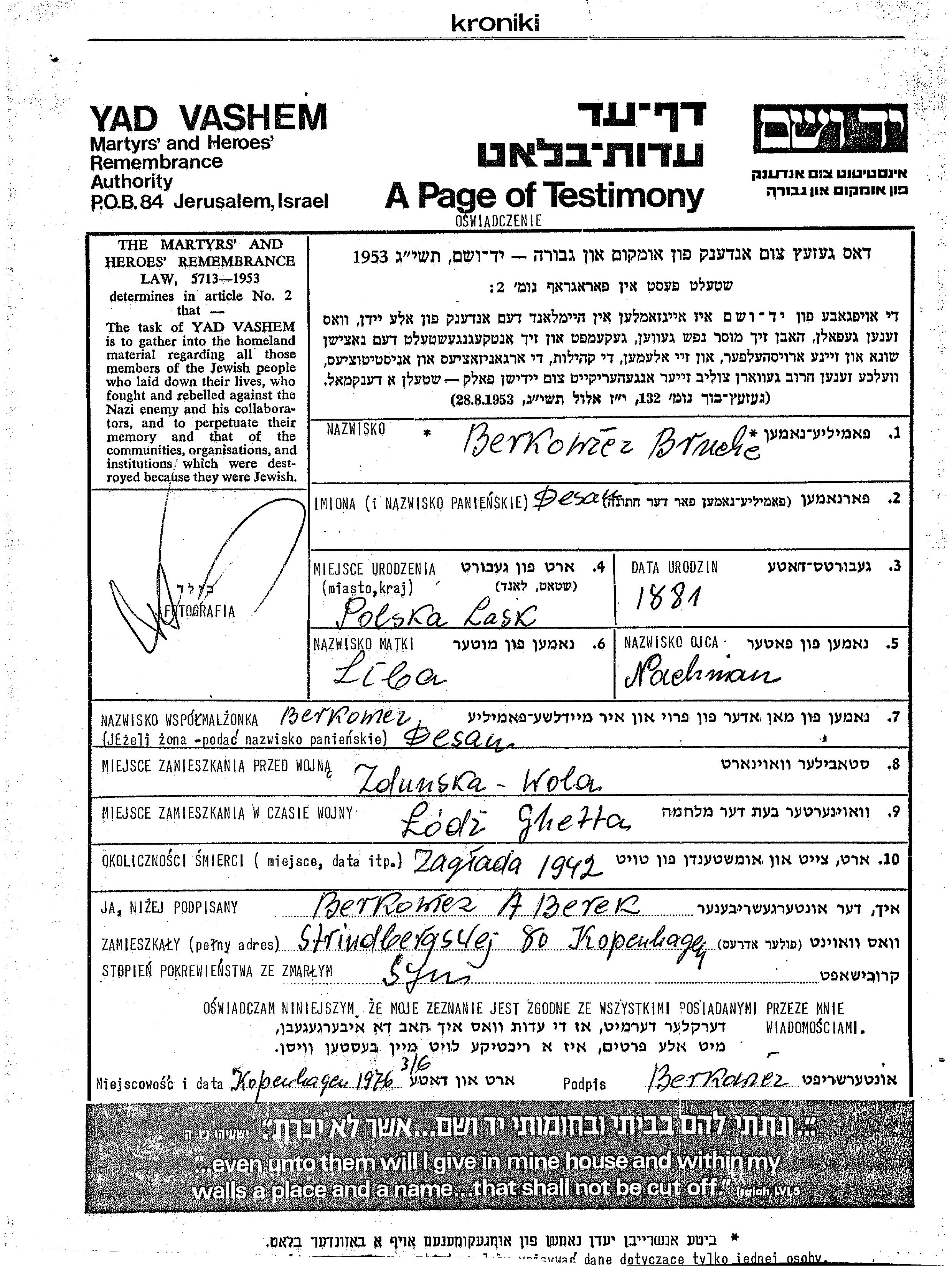 Bruche Berkowicz, geb. Desau wurde im Jahr 1881 in Lask, Polen geboren. Sie war die Tochter von Nachman und Liba. Sie war Verheiratet. Vor dem Zweiten Weltkrieg lebte sie in Zdunska Wola, Polen. Während des Krieges war sie in Lodz, Polen.
