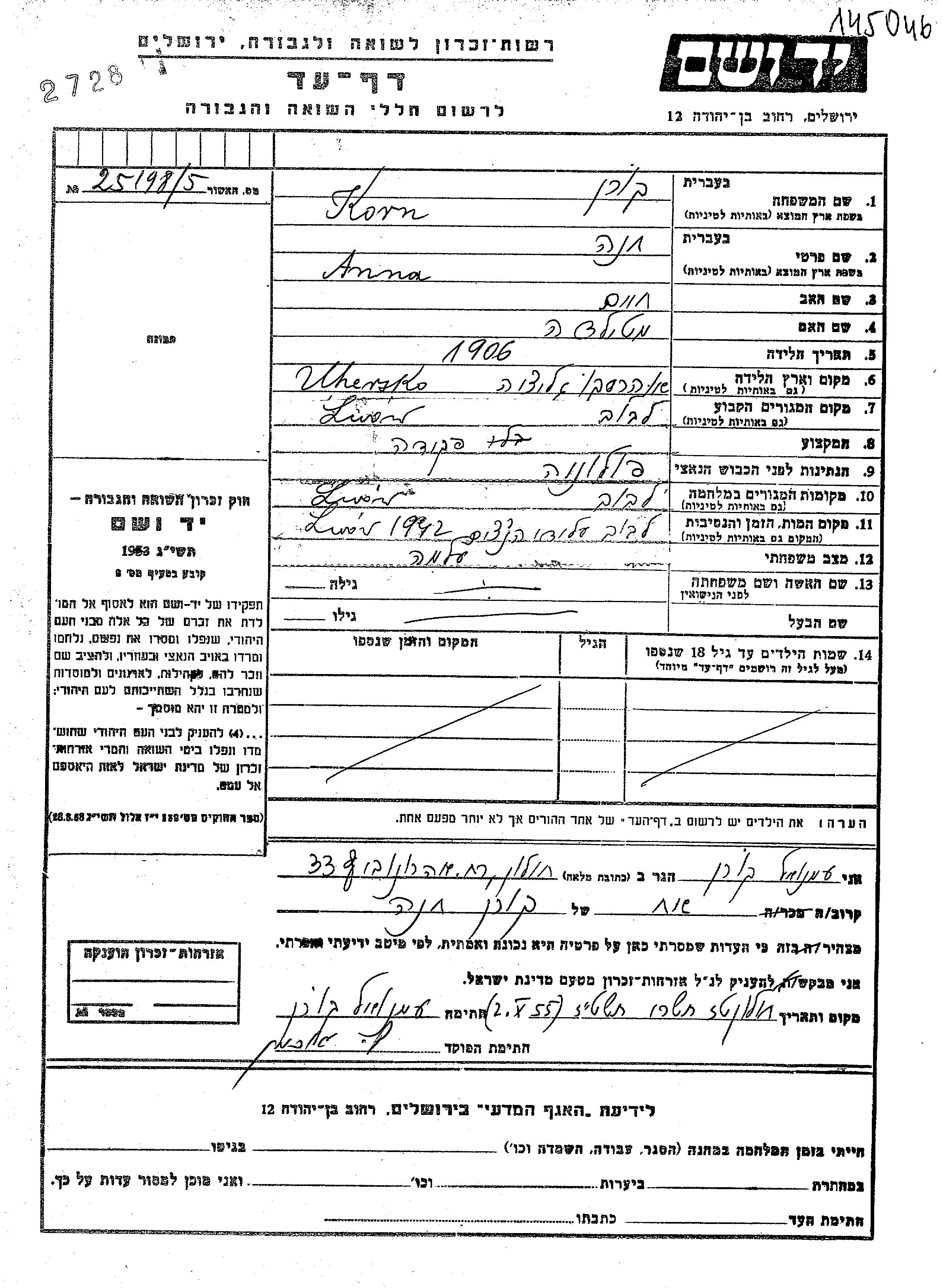 Anna Khana Korn wurde im Jahr 1906 in Uhersko, Polen geboren. Sie war die Tochter von Khaim und Matilda. Sie war Angestellte/-r und Ledig. Vor dem Zweiten Weltkrieg lebte sie in Lwow, Polen. Während des Krieges war sie in Lwow, Polen.