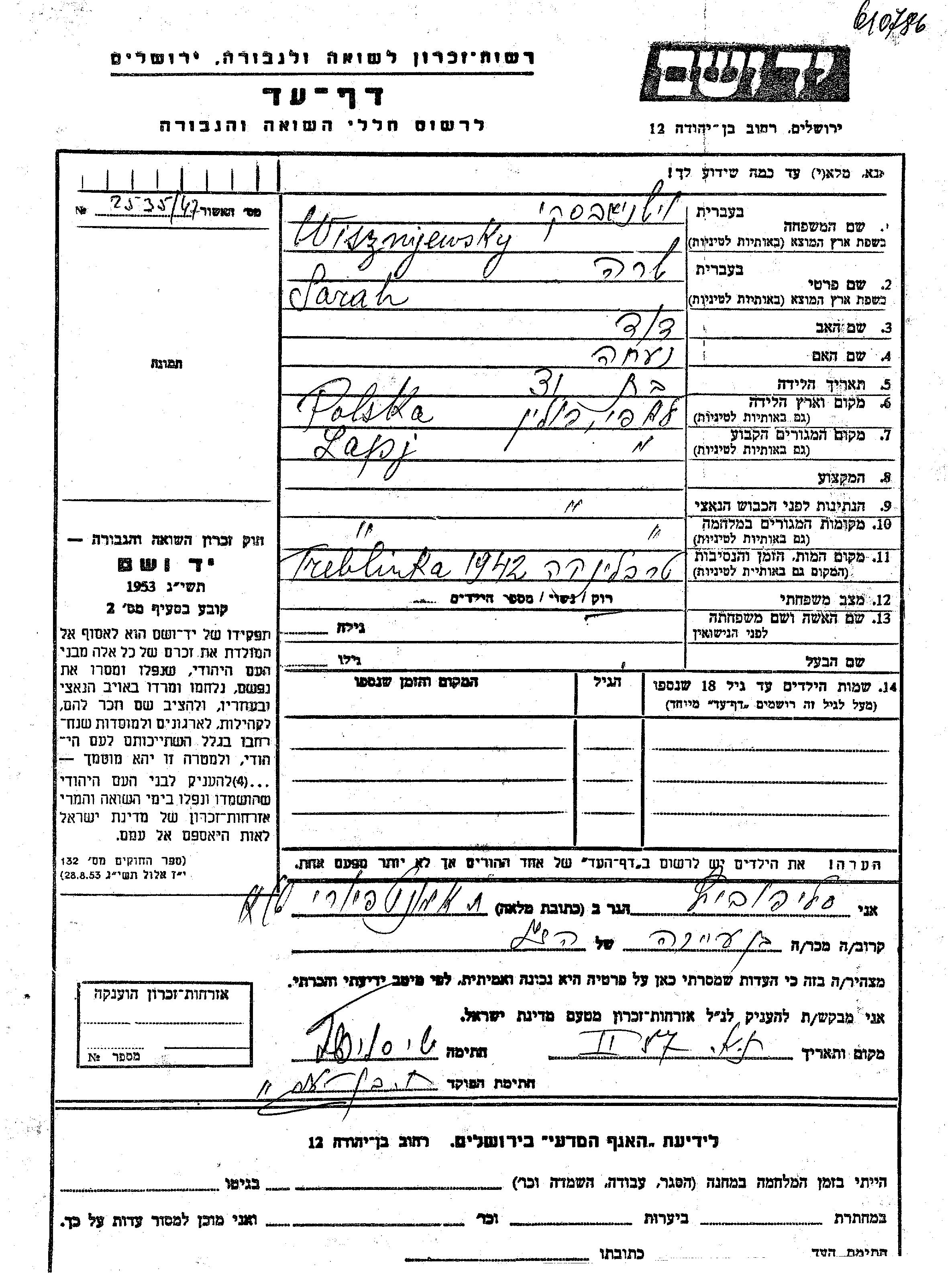 Wisznijewsky Sarah Łapy, Polen Gedenkblatt