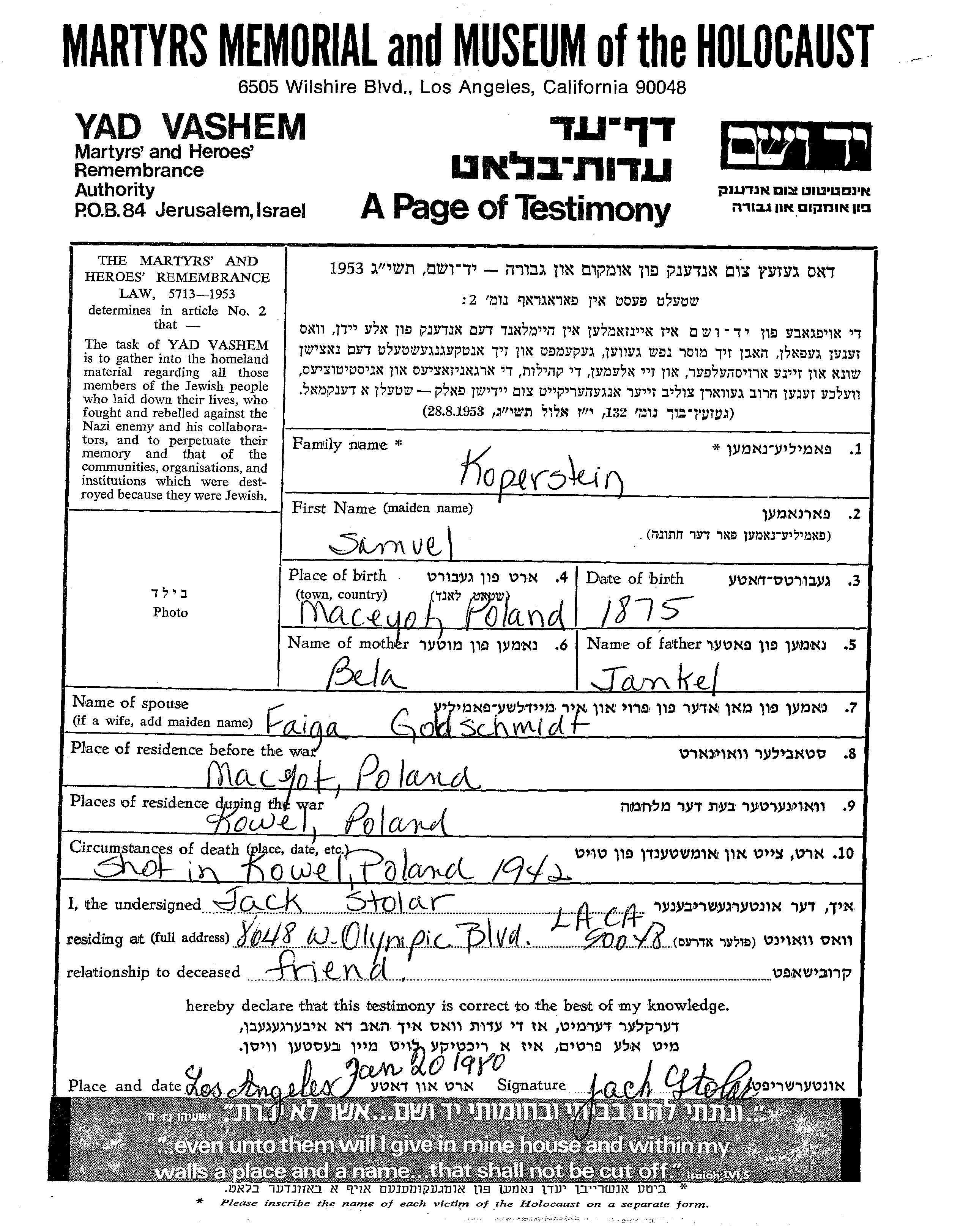 Samuel Koperstein wurde im Jahr 1875 in Macejov, Polen geboren. Er war der Sohn von Jankel und Bela. Er war mit Faiga, geb. Goldschmidt Verheiratet. Vor dem Zweiten Weltkrieg lebte er in Macejov, Polen. Während des Krieges war er in Kowel, Polen.