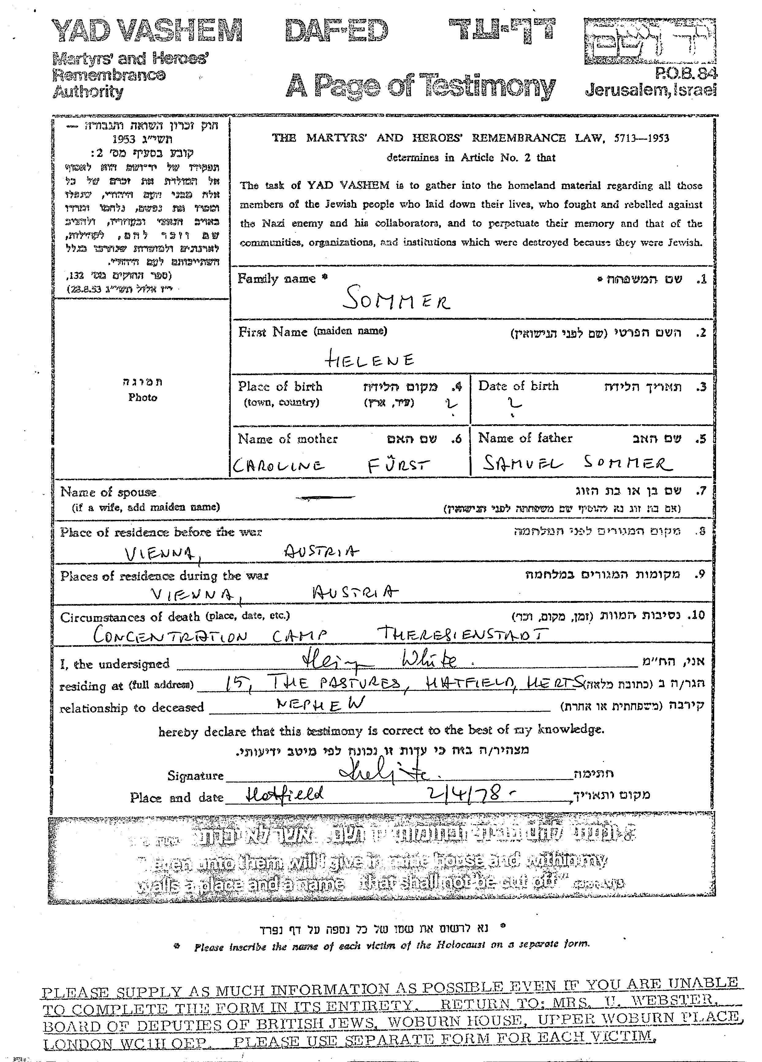 Helene Sommer wurde Sie war die Tochter von Samuel und Caroline. Vor dem Zweiten Weltkrieg lebte sie in Vienna, Österreich. Während des Krieges war sie in Vienna, Österreich.