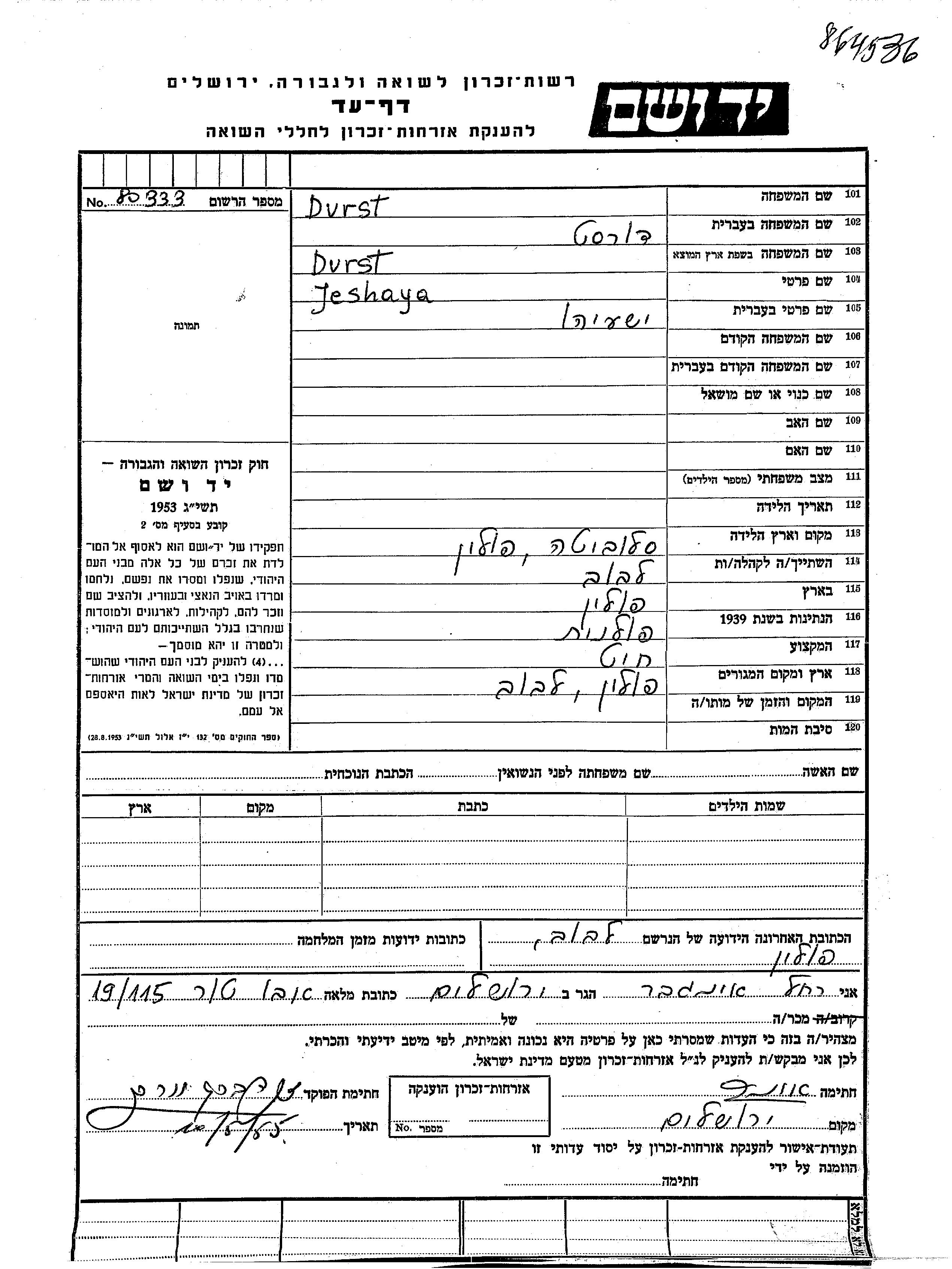 Jeshaya Durst wurde in Slovita, Ukraine (UdSSR) geboren. Er war Schneider. Vor dem Zweiten Weltkrieg lebte er in Lwow, Polen. Während des Krieges war er in Lwow, Polen.