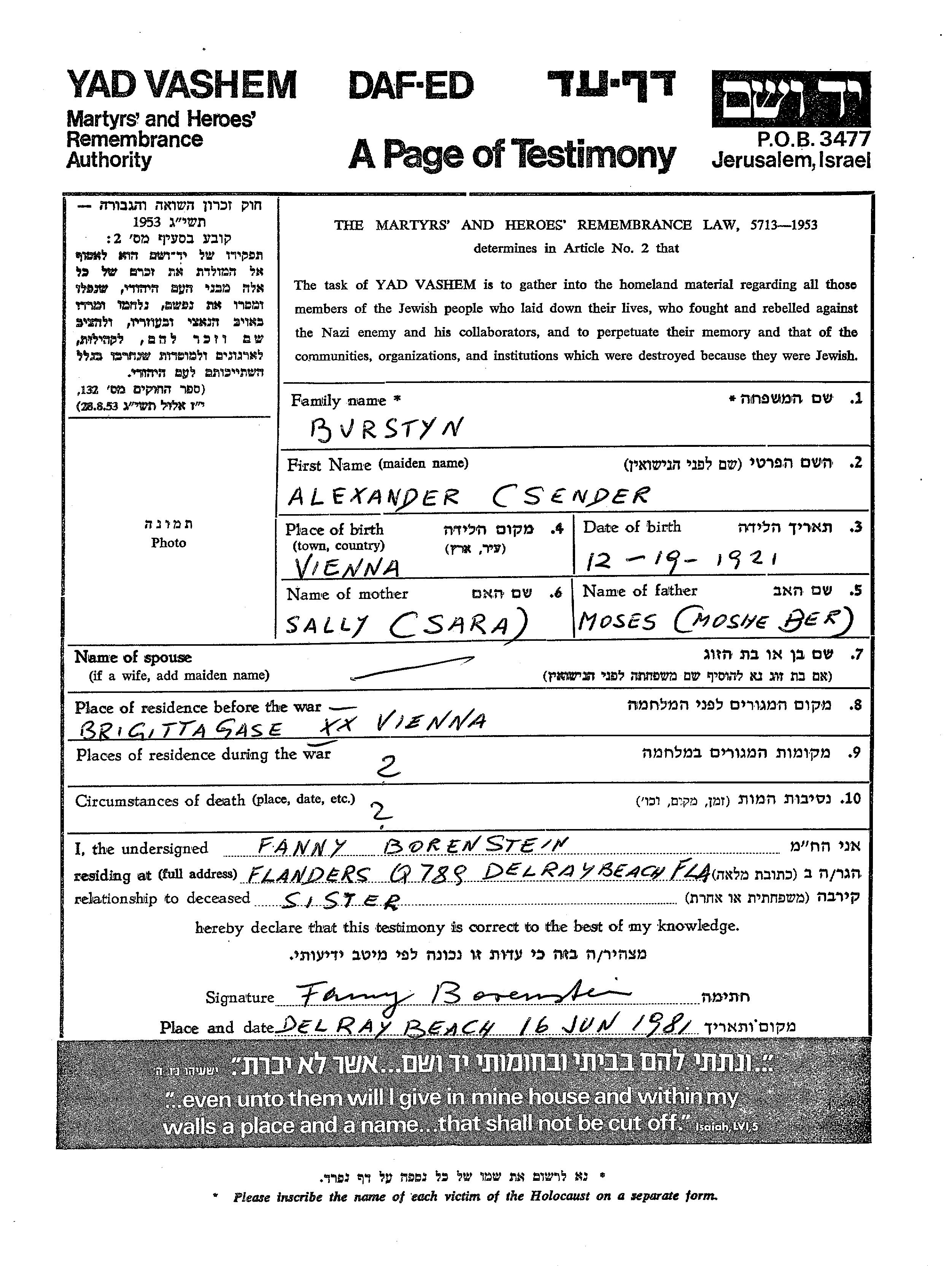 Alexander Burstyn wurde im Jahr 1921 in Vienna, Österreich geboren. Er war der Sohn von Moshe Ber und Sally Sara. Vor dem Zweiten Weltkrieg lebte er in Vienna, Österreich.