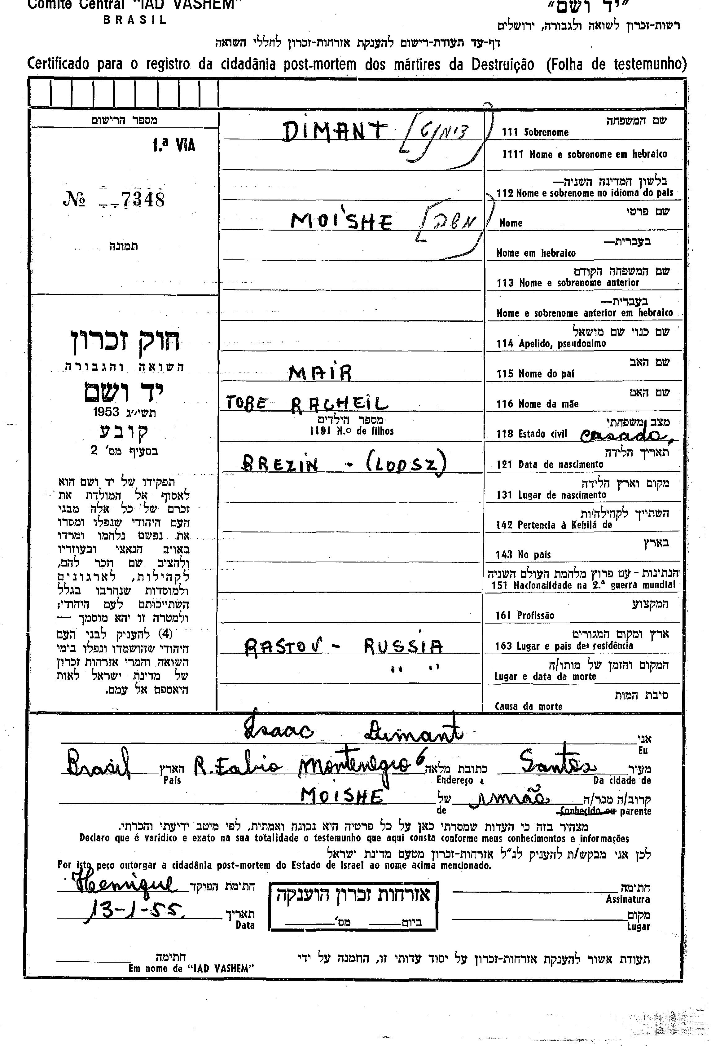 Moishe Dimant wurde in Breziny, Polen geboren. Er war der Sohn von Mair und Tobe Racheil. Er war Verheiratet. Während des Krieges war er in Rostow, Russland (UdSSR).