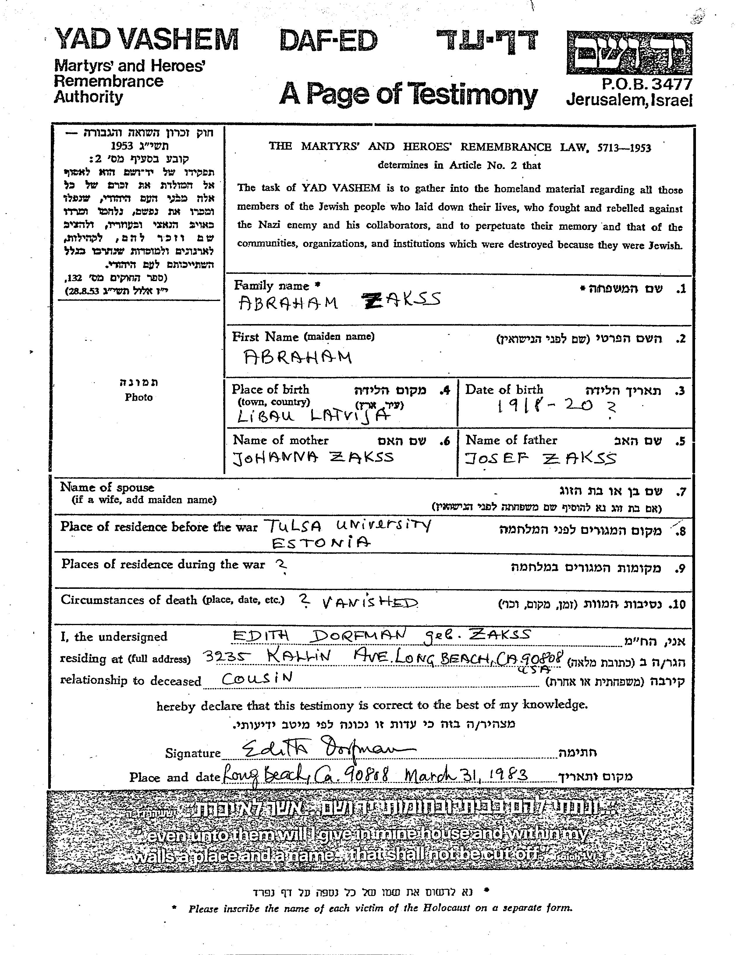 Abraham Zakss wurde im Jahr 1918 in Libau, Lettland geboren. Er war der Sohn von Josef und Johanna. Vor dem Zweiten Weltkrieg lebte er in Estland.