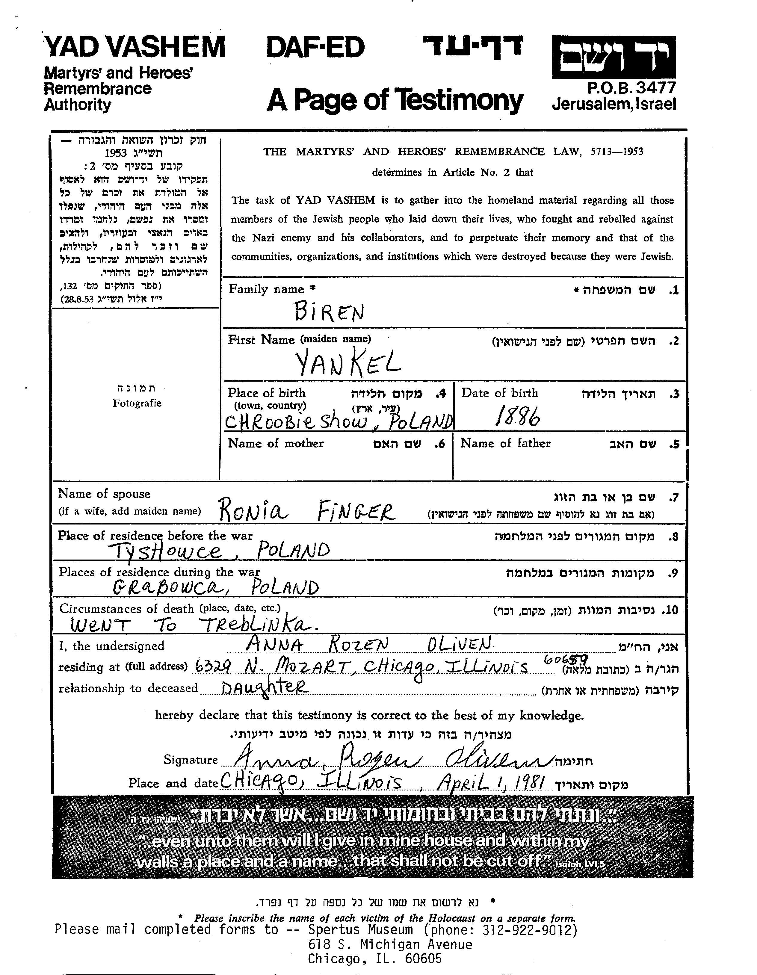 Yankel Biren wurde im Jahr 1886 in Chrobieshov, Polen geboren. Er war mit Ronia, geb. Finger Verheiratet. Vor dem Zweiten Weltkrieg lebte er in Tyszowce, Polen. Während des Krieges war er in Grabowiec, Polen.