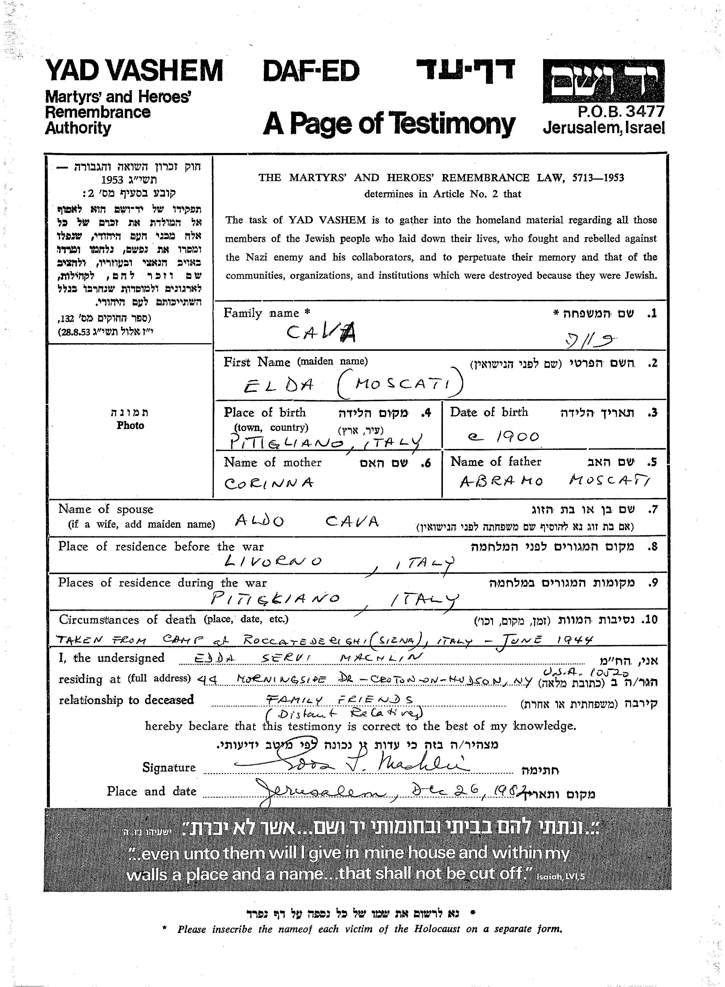 Elda Cava, geb. Moscati wurde im Jahr 1900 in Pitigliano, Italien geboren. Sie war die Tochter von Abramo und Corinna. Sie war mit Aldo Verheiratet. Vor dem Zweiten Weltkrieg lebte sie in Livorno, Italien. Während des Krieges war sie in Pitigliano, Italien.