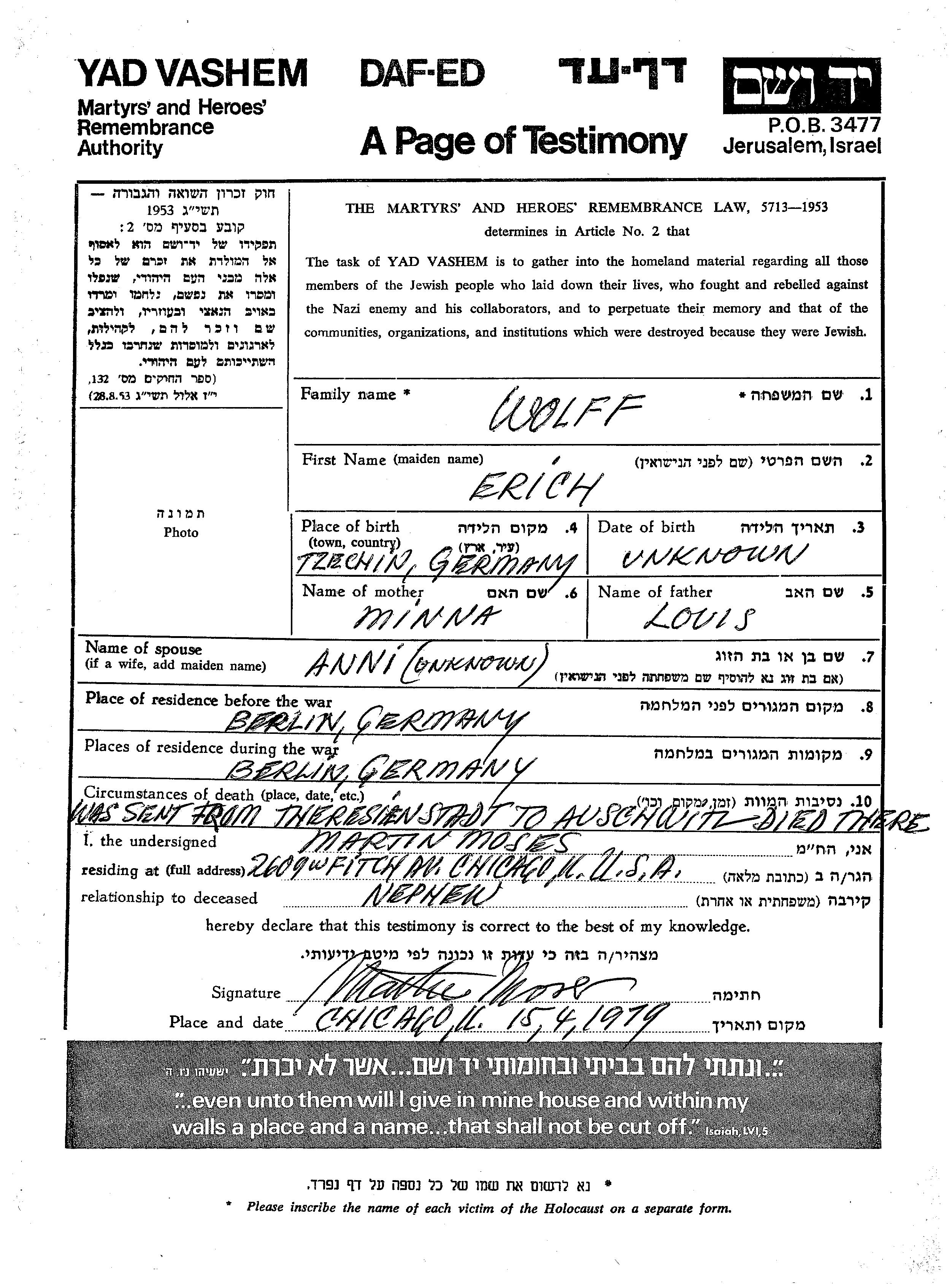 Erich Wolff wurde in Tschechen, Deutsches Reich geboren. Er war der Sohn von Louis und Minna. Er war mit Anni Verheiratet. Vor dem Zweiten Weltkrieg lebte er in Berlin, Deutsches Reich. Während des Krieges war er in Berlin, Deutsches Reich.