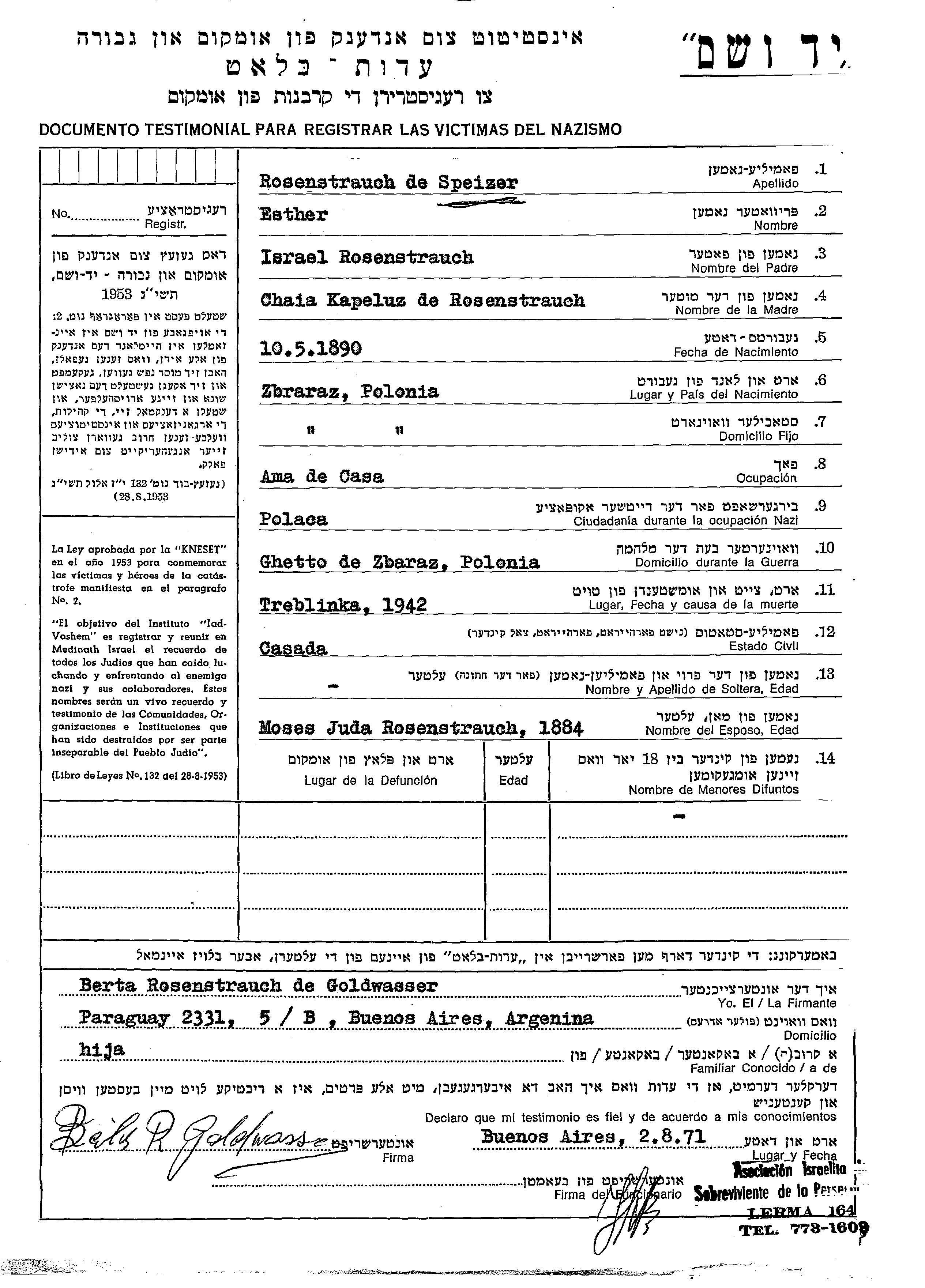 Esther Rosenstrauch, geb. Speizer wurde im Jahr 1890 in Zbaraz, Polen geboren. Sie war die Tochter von Israel und Chaia. Sie war Hausfrau und mit Moses Juda Verheiratet. Vor dem Zweiten Weltkrieg lebte sie in Zbaraz, Polen. Während des Krieges war sie in Zbaraz, Polen.
