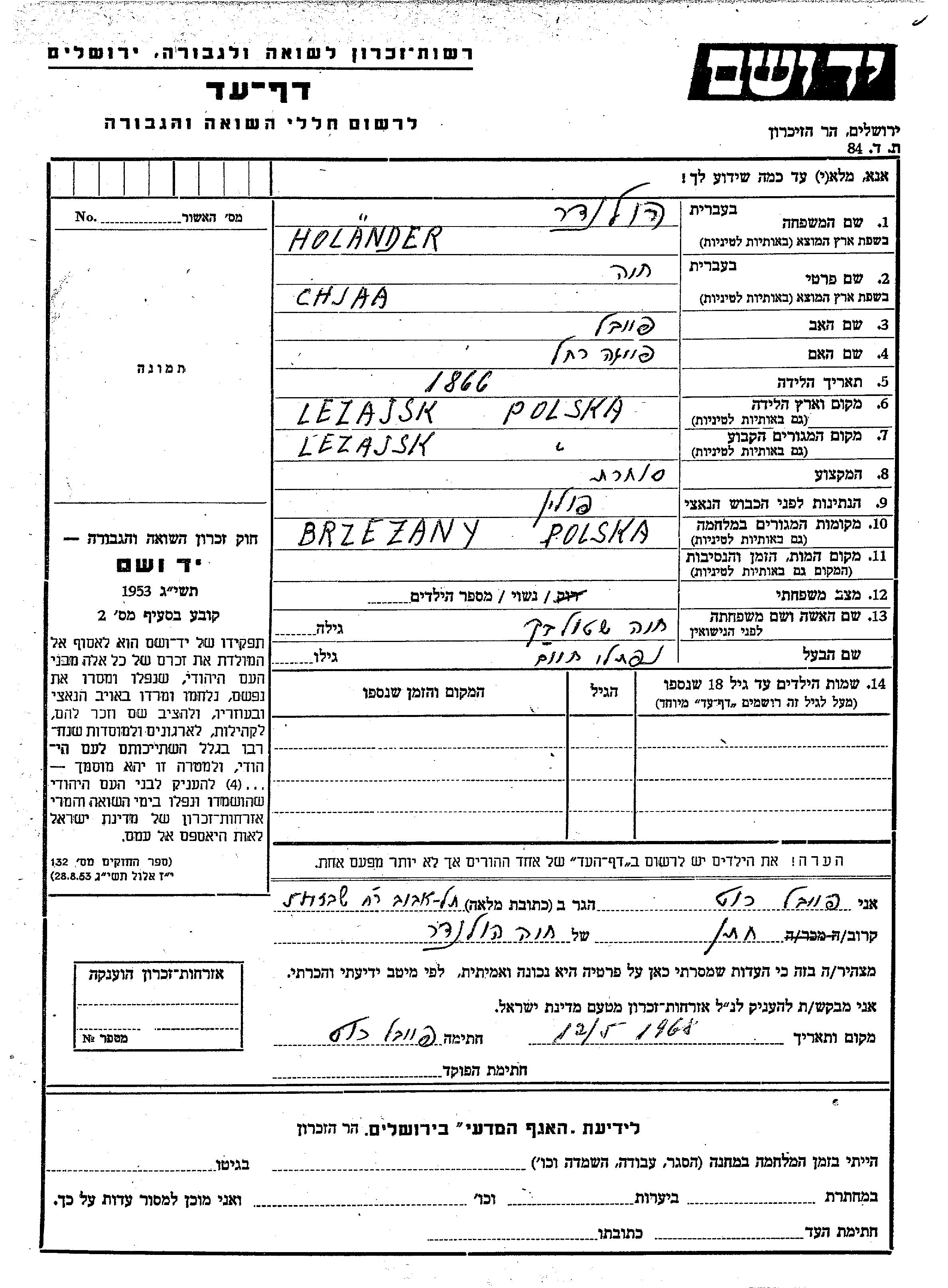 Chjaa Holaender, geb. Shtulbakh wurde im Jahr 1866 in Lezajsk, Polen geboren. Sie war die Tochter von Faivel und Feiga Rakhel. Sie war Kaufmann/-frau und mit Naftali Khaim Verheiratet. Vor dem Zweiten Weltkrieg lebte sie in Lezajsk, Polen. Während des Krieges war sie in Brzezany, Polen.