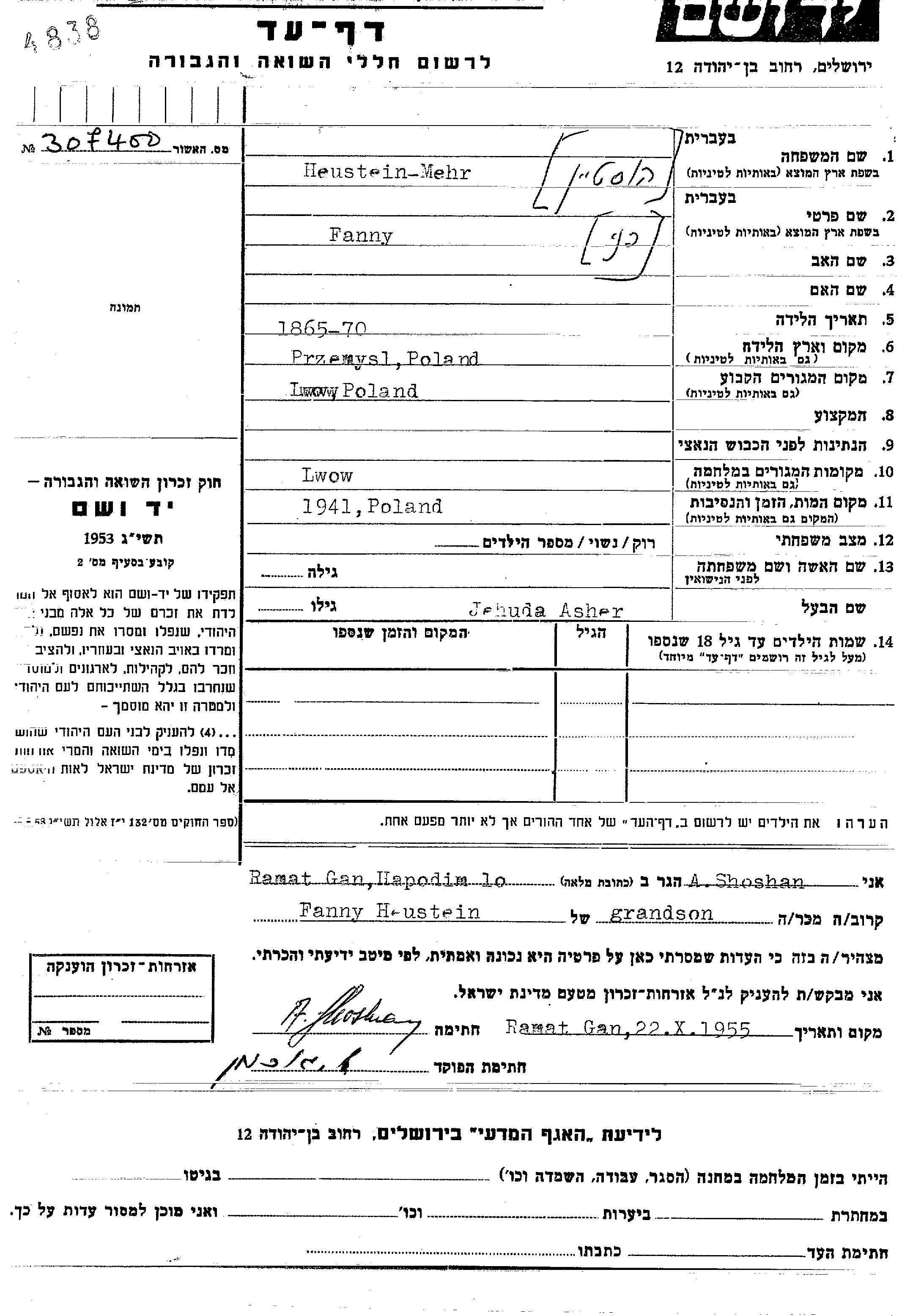 Fanny Heustein Mehr Hustin, geb. Mehr wurde im Jahr 1865 in Przemysl, Polen geboren. Sie war mit Jehuda Asher Verheiratet. Vor dem Zweiten Weltkrieg lebte sie in Lwow, Polen. Während des Krieges war sie in Lwow, Polen.