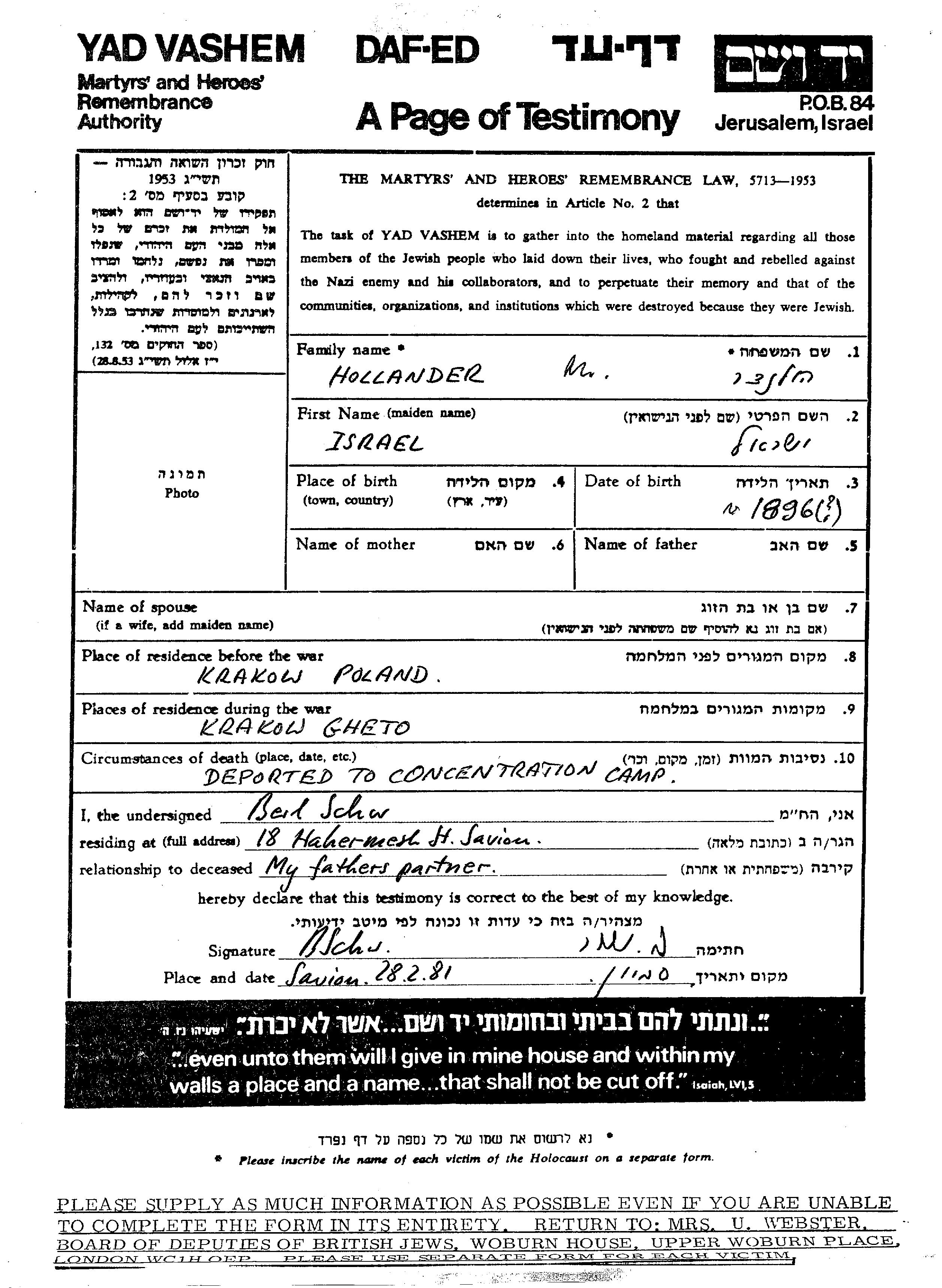 Israel Hollander wurde im Jahr 1896 geboren. Vor dem Zweiten Weltkrieg lebte er in Krakow, Polen. Während des Krieges war er in Krakow, Polen.