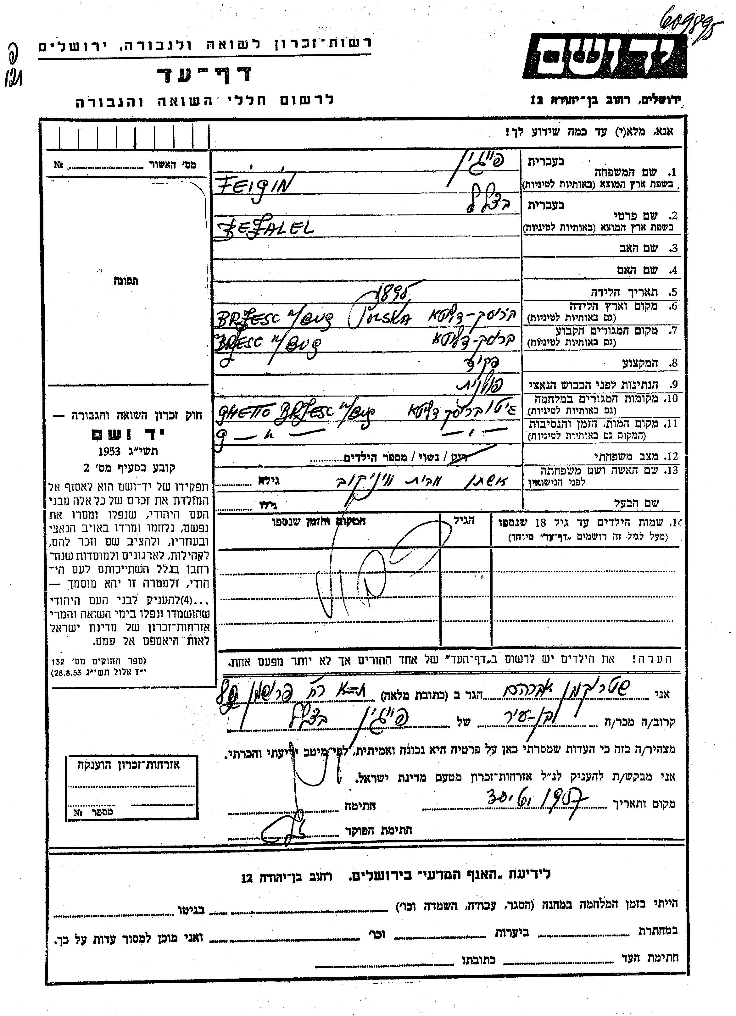 Feigin Bezalel 1895 Brześć nad Bugiem, Polen Gedenkblatt