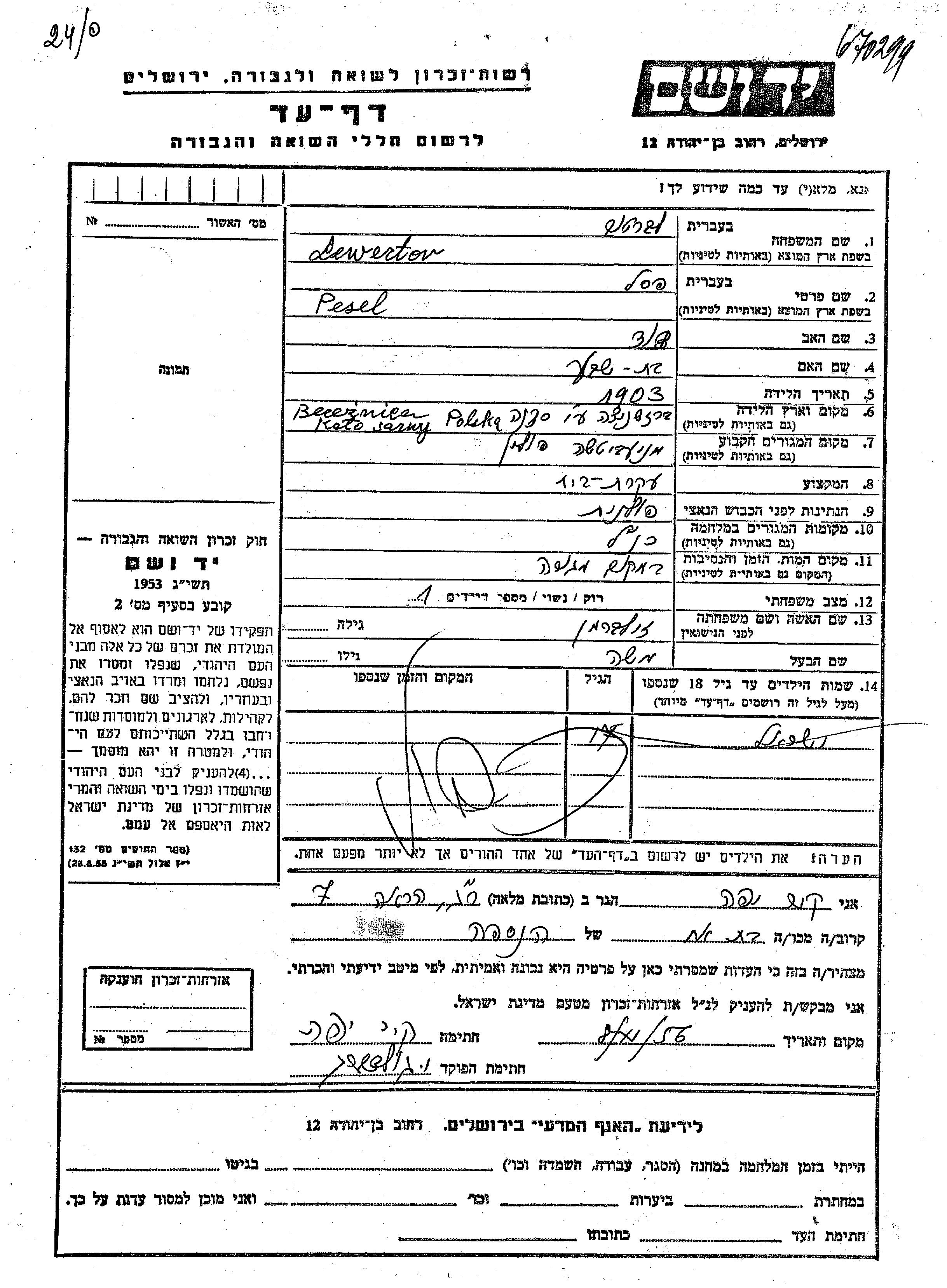 Pesel Lewertov, geb. Zilberman wurde im Jahr 1903 in Bereznica, Polen geboren. Sie war die Tochter von David und Batsheva. Sie war Hausfrau und mit Moshe Verheiratet. Vor dem Zweiten Weltkrieg lebte sie in Maniewicze, Polen. Während des Krieges war sie in Maniewicze, Polen.