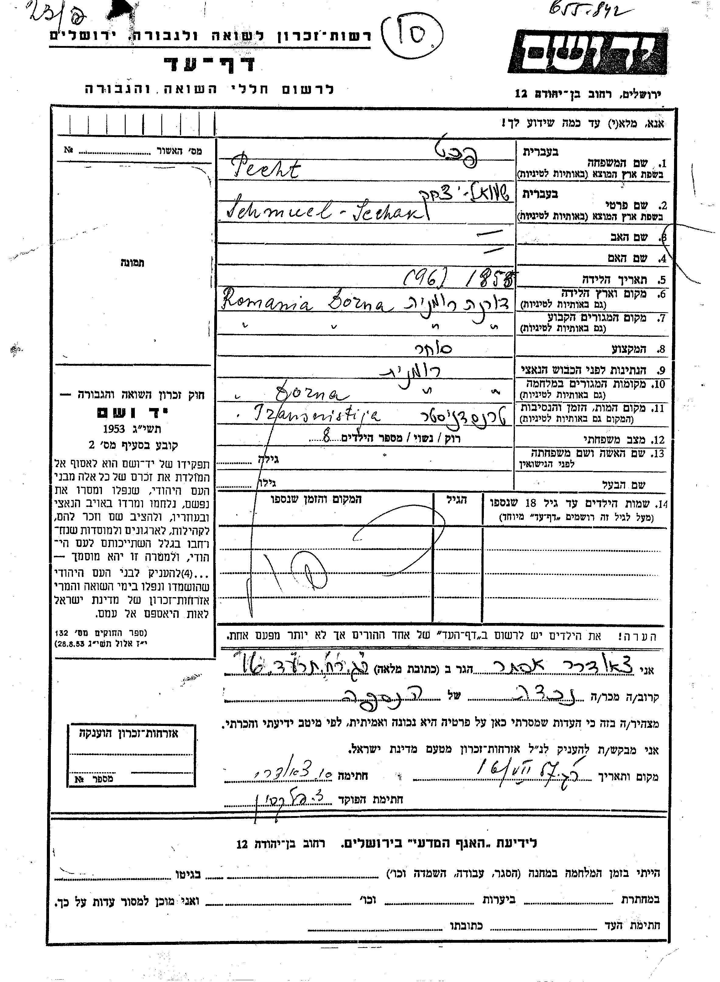 Schmuel Icchak Pecht wurde im Jahr 1858 in Dorna, Rumänien geboren. Er war Kaufmann/-frau und Verheiratet. Vor dem Zweiten Weltkrieg lebte er in Dorna, Rumänien. Während des Krieges war er in Dorna, Rumänien.