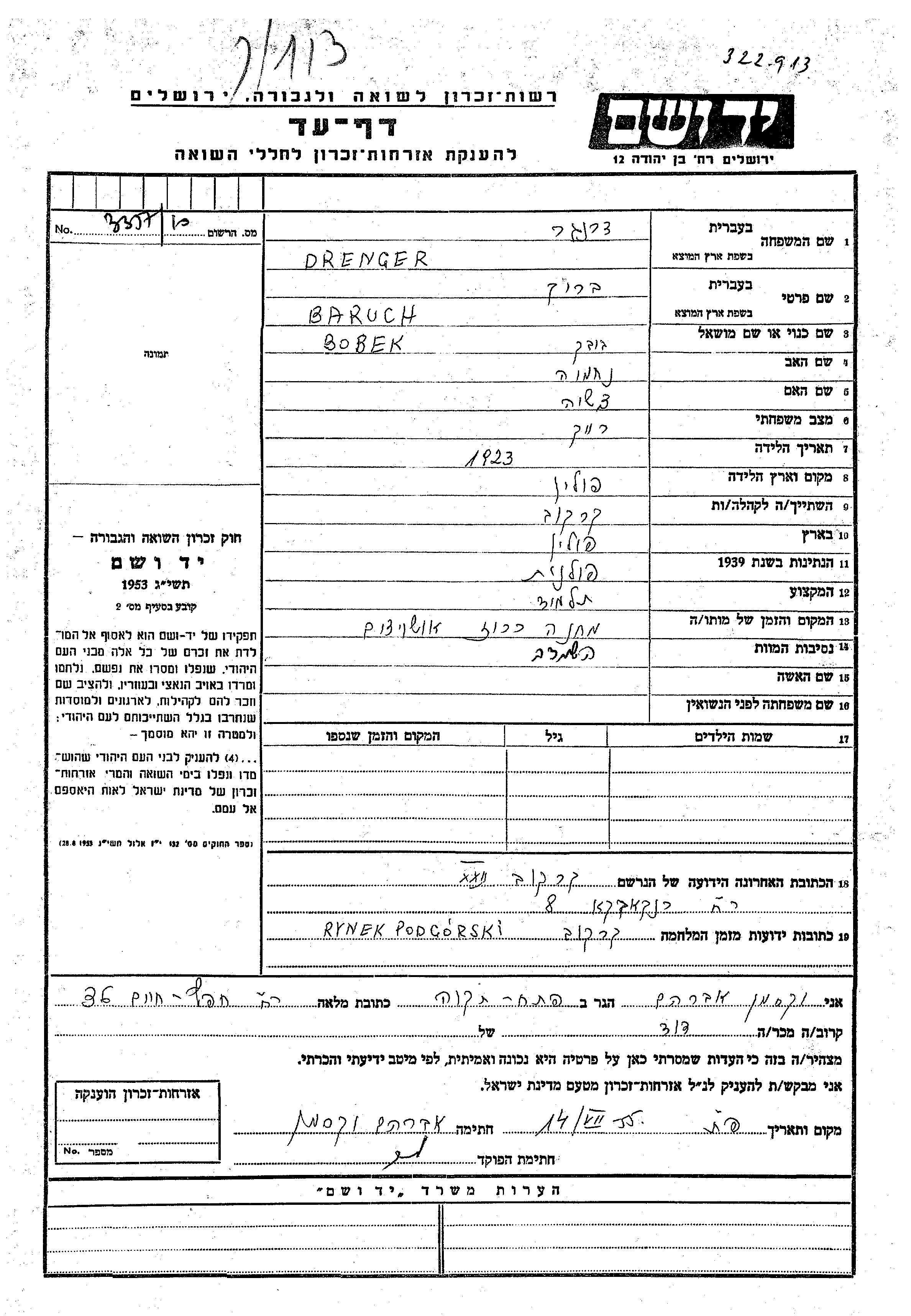 Baruch Bobek Drenger wurde im Jahr 1923 in Polen geboren. Er war der Sohn von Nekhemia und Tzesia. Er war Schüler/-in und Ledig. Vor dem Zweiten Weltkrieg lebte er in Krakow, Polen. Während des Krieges war er in Krakow, Polen.