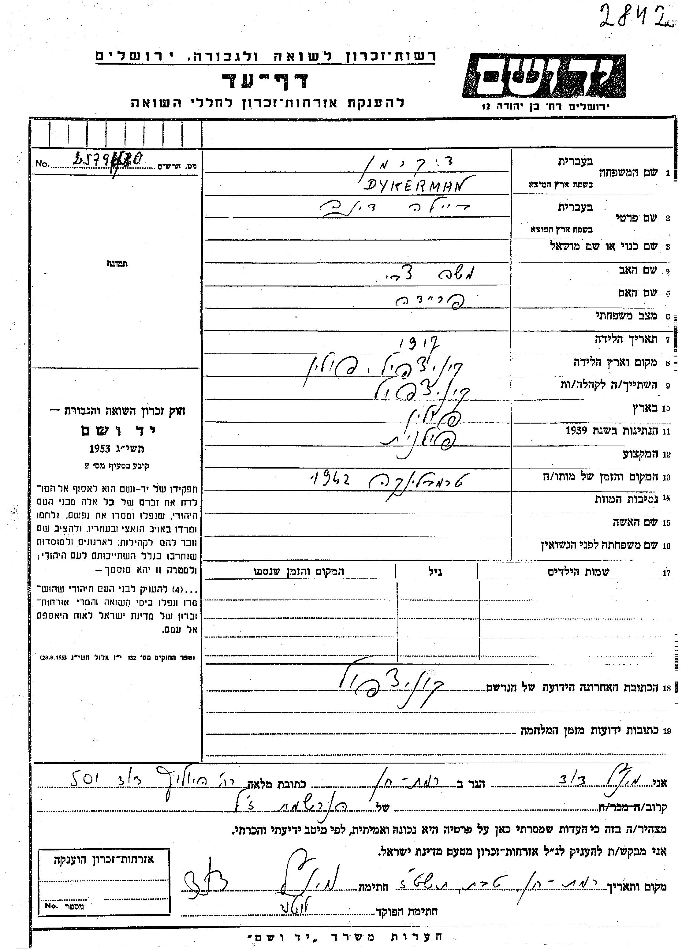Suche nach einem Todesjahr im Zeitraum der Holocaust: 1933 bis 1945. Bitte wählen Sie 'Exakt' im Auswahlmenü, um nur nach einem einzelnen Jahr zu suchen, alternativ können Sie die flexibleren Optionen '+/- 2 Jahre' oder '+/- 5 Jahre' wählen.