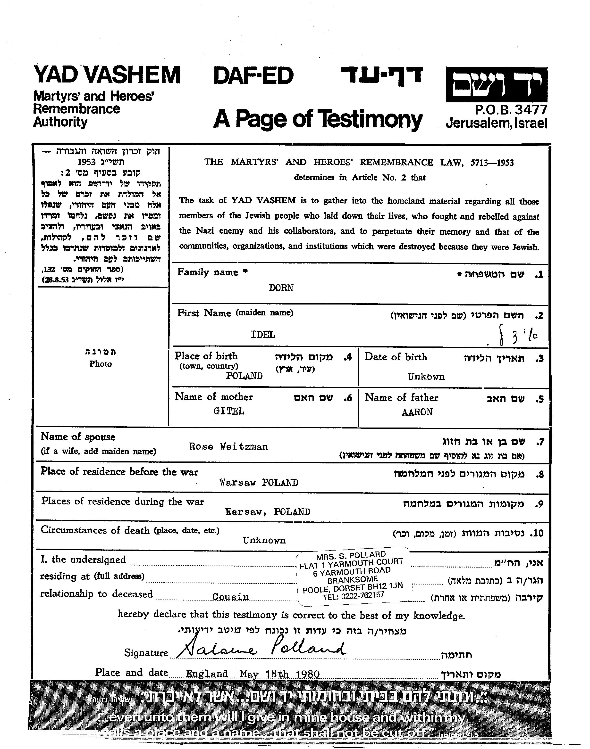 Idel Dorn wurde in Polen geboren. Er war der Sohn von Aaron und Gitel. Er war mit Rose, geb. Weitzman Verheiratet. Vor dem Zweiten Weltkrieg lebte er in Warsaw, Polen. Während des Krieges war er in Warsaw, Polen.