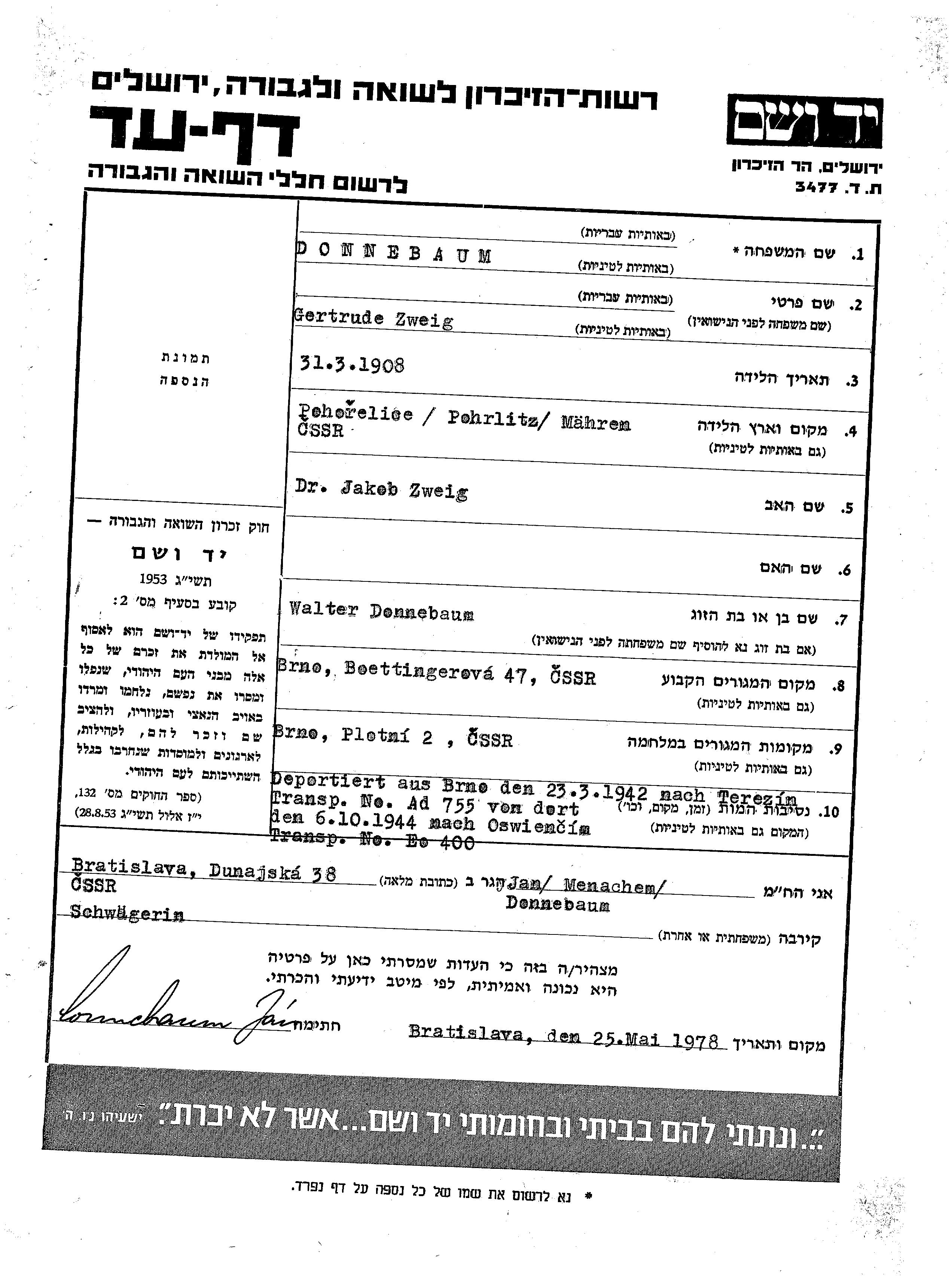 Gertrude Donnebaum, geb. Zweig wurde im Jahr 1908 in Pohorelice, Tschechoslowakei geboren. Sie war die Tochter von Jakob. Sie war mit Walter Verheiratet. Vor dem Zweiten Weltkrieg lebte sie in Brno, Tschechoslowakei. Während des Krieges war sie in Brno, Tschechoslowakei.