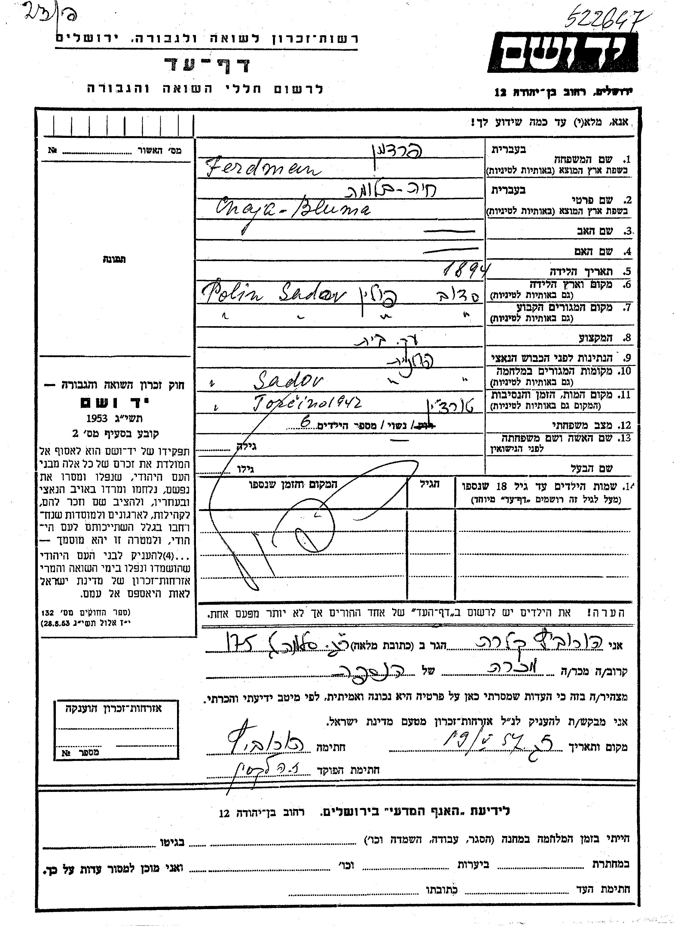Chaja Bluma Ferdman wurde im Jahr 1894 in Sadow, Polen geboren. Sie war Hausfrau und Verheiratet. Vor dem Zweiten Weltkrieg lebte sie in Sadow, Polen. Während des Krieges war sie in Sadow, Polen.