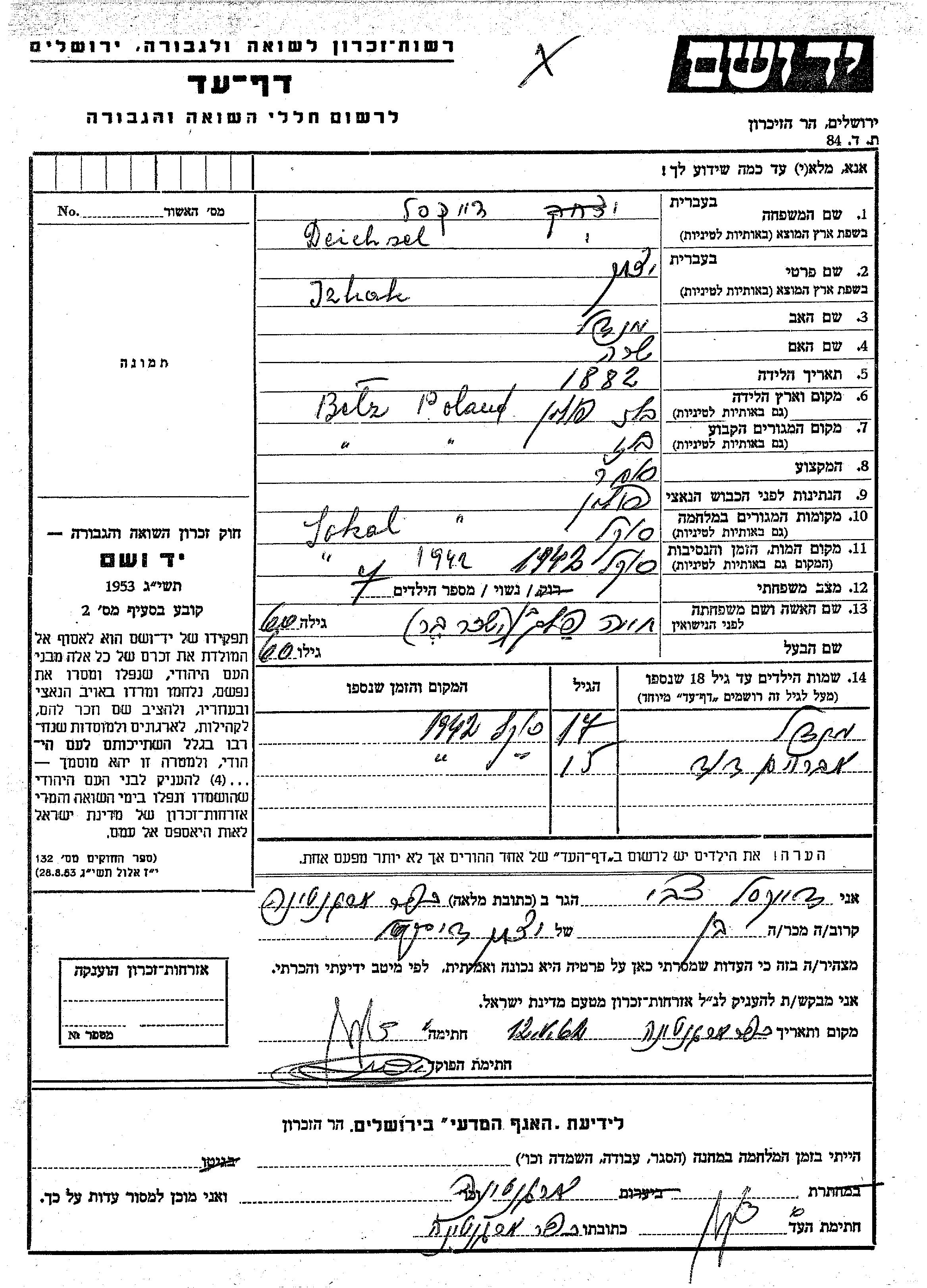 Jzhak Deichsel wurde im Jahr 1882 in Belz, Polen geboren. Er war der Sohn von Mendel und Sara. Er war Kaufmann/-frau. Vor dem Zweiten Weltkrieg lebte er in Sokol, Polen. Während des Krieges war er in Sokol, Polen.