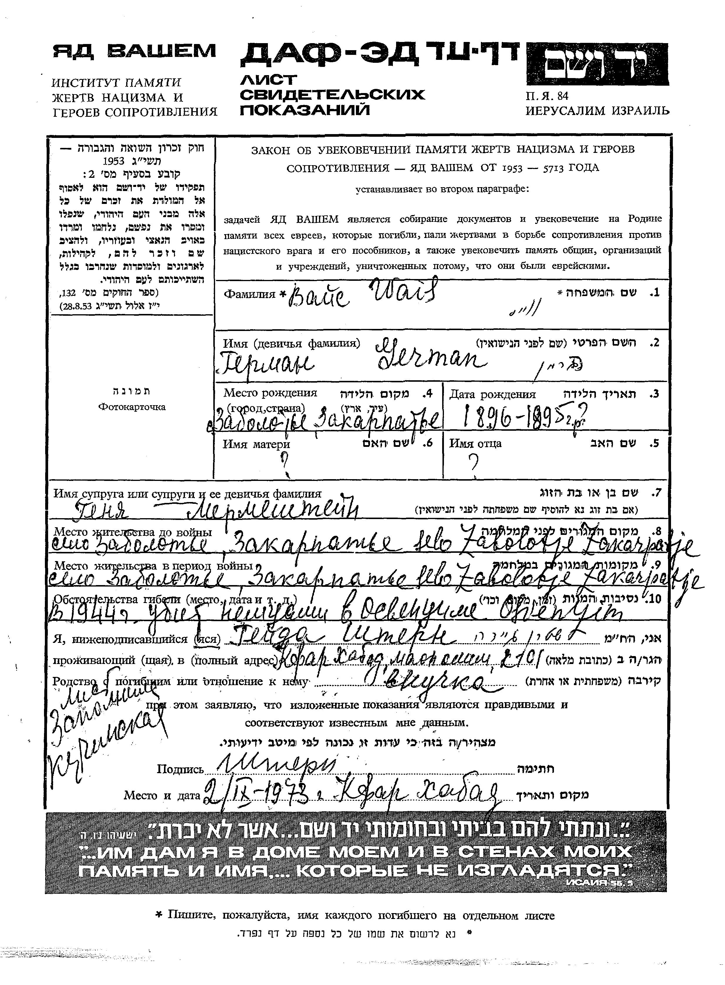 German wurde in der Schoah ermordet. Todesort: Auschwitz, Polen im Jahr 1944.