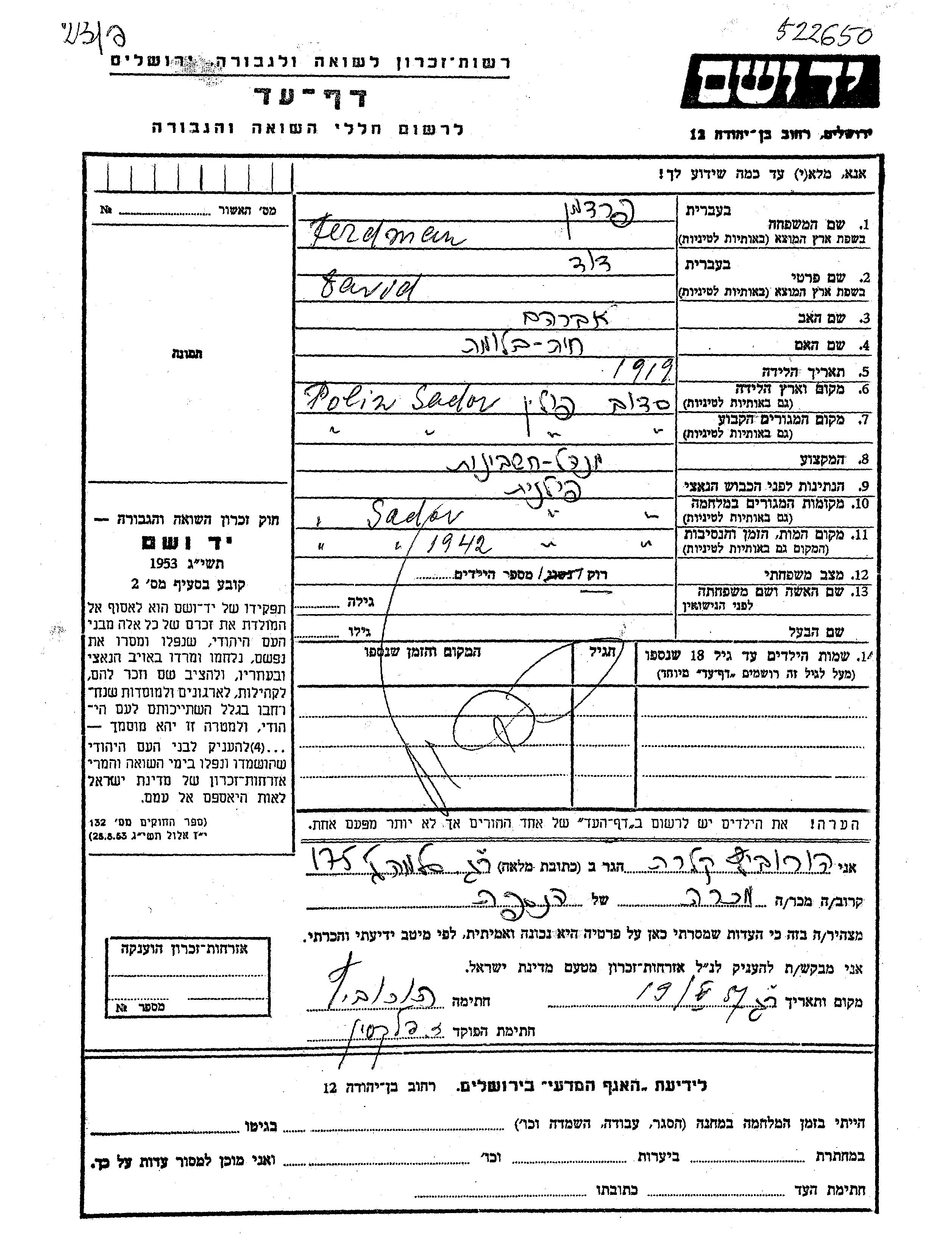 David wurde in der Schoah ermordet. Todesort: Sadow, Polen im Jahr 1942.