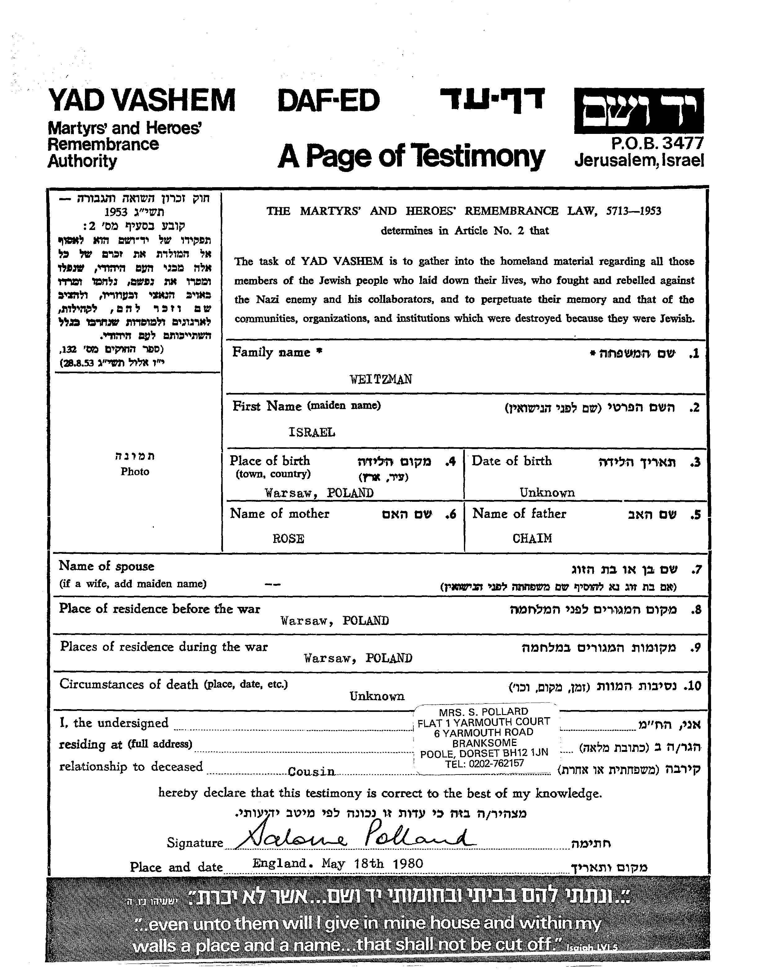 Weitzman Israel Warszawa, Polen Gedenkblatt