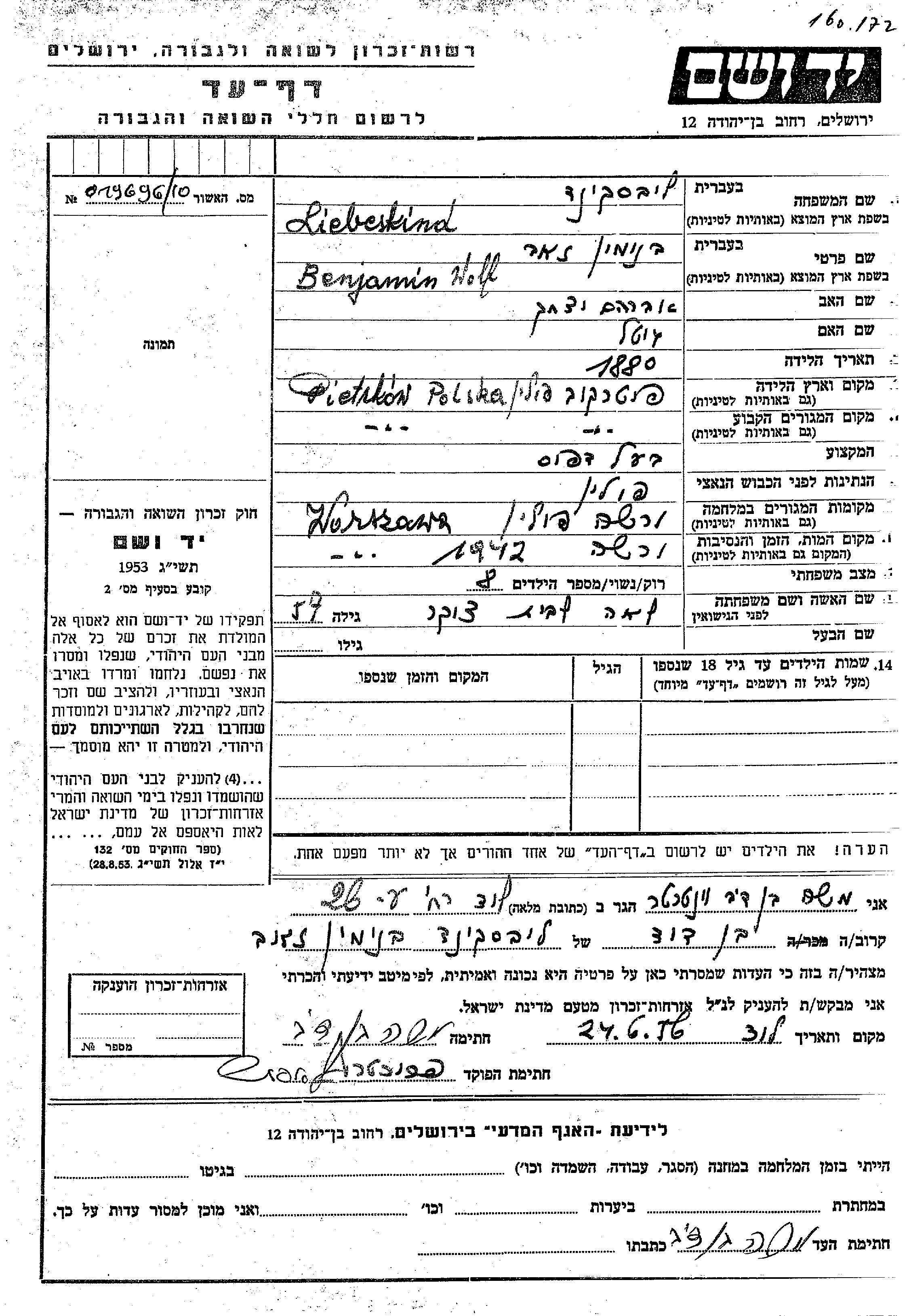 Benjamin Wolf Zeev Liebeskind wurde im Jahr 1880 in Piotrkow, Polen geboren. Er war der Sohn von Avraham Yitzkhak und Gitel. Er war Druckereibesitzer und mit Lea, geb. Tzuker Verheiratet. Vor dem Zweiten Weltkrieg lebte er in Piotrkow, Polen. Während des Krieges war er in Warsaw, Polen.
