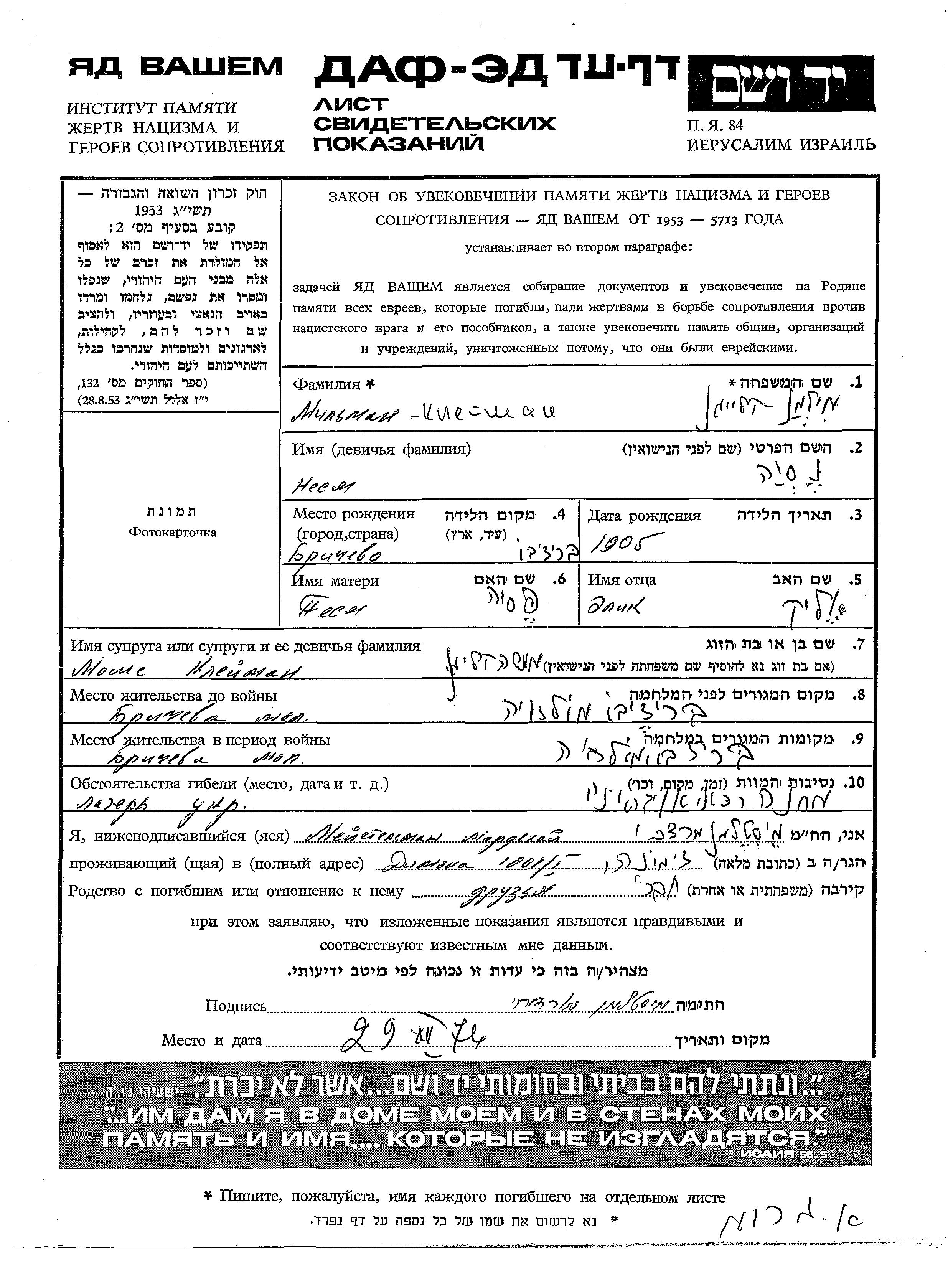Nesya Milman Kleiman, geb. Milman wurde im Jahr 1905 in Brichevo, Rumänien geboren. Sie war die Tochter von Alik Elik und Pesya. Sie war mit Moshe Verheiratet. Vor dem Zweiten Weltkrieg lebte sie in Brichevo, Rumänien. Während des Krieges war sie in Brichevo, Rumänien.