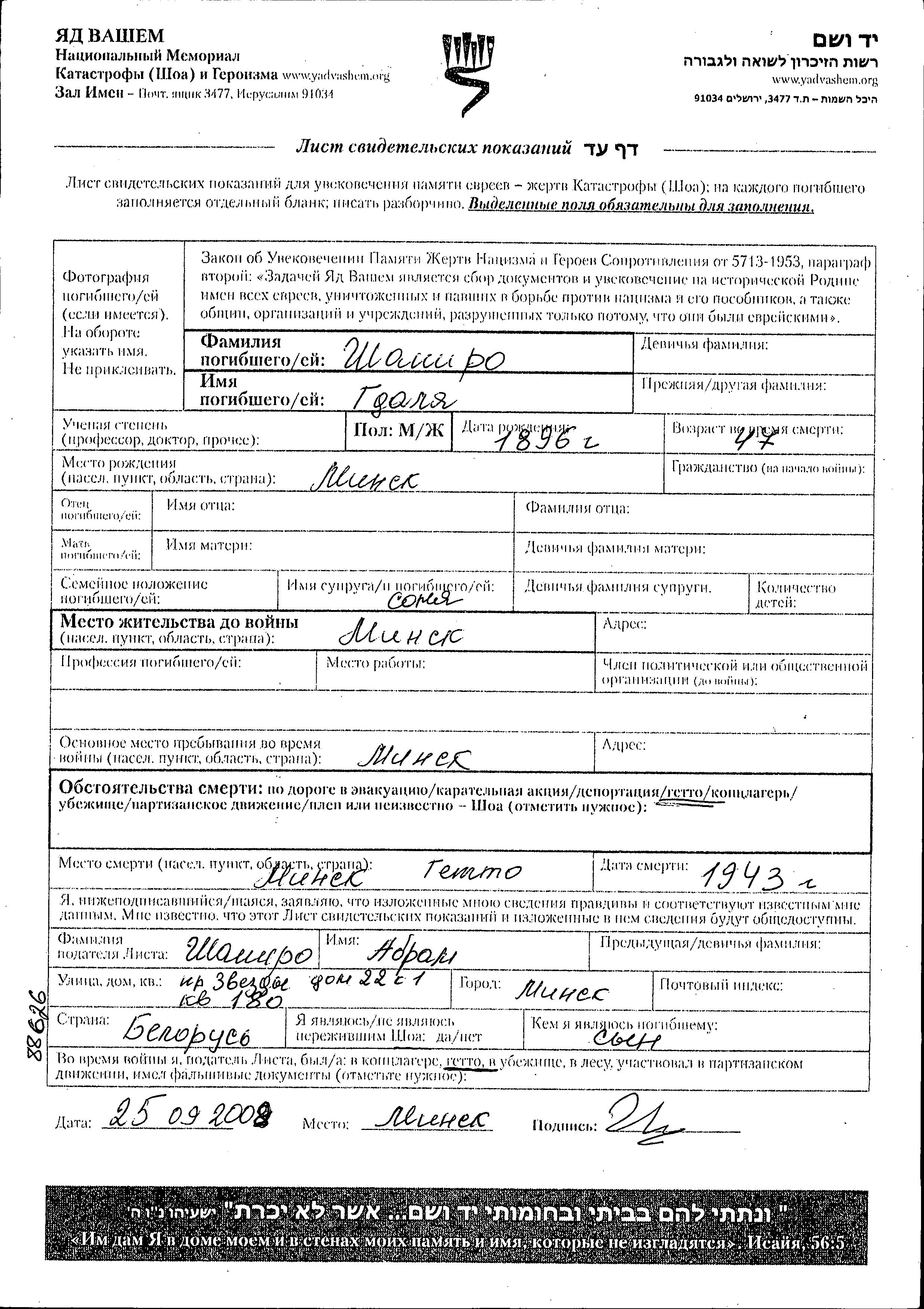 Gdalya wurde in der Schoah ermordet. Todesort: Minsk, Weißrussland (UdSSR) im Jahr 1943.