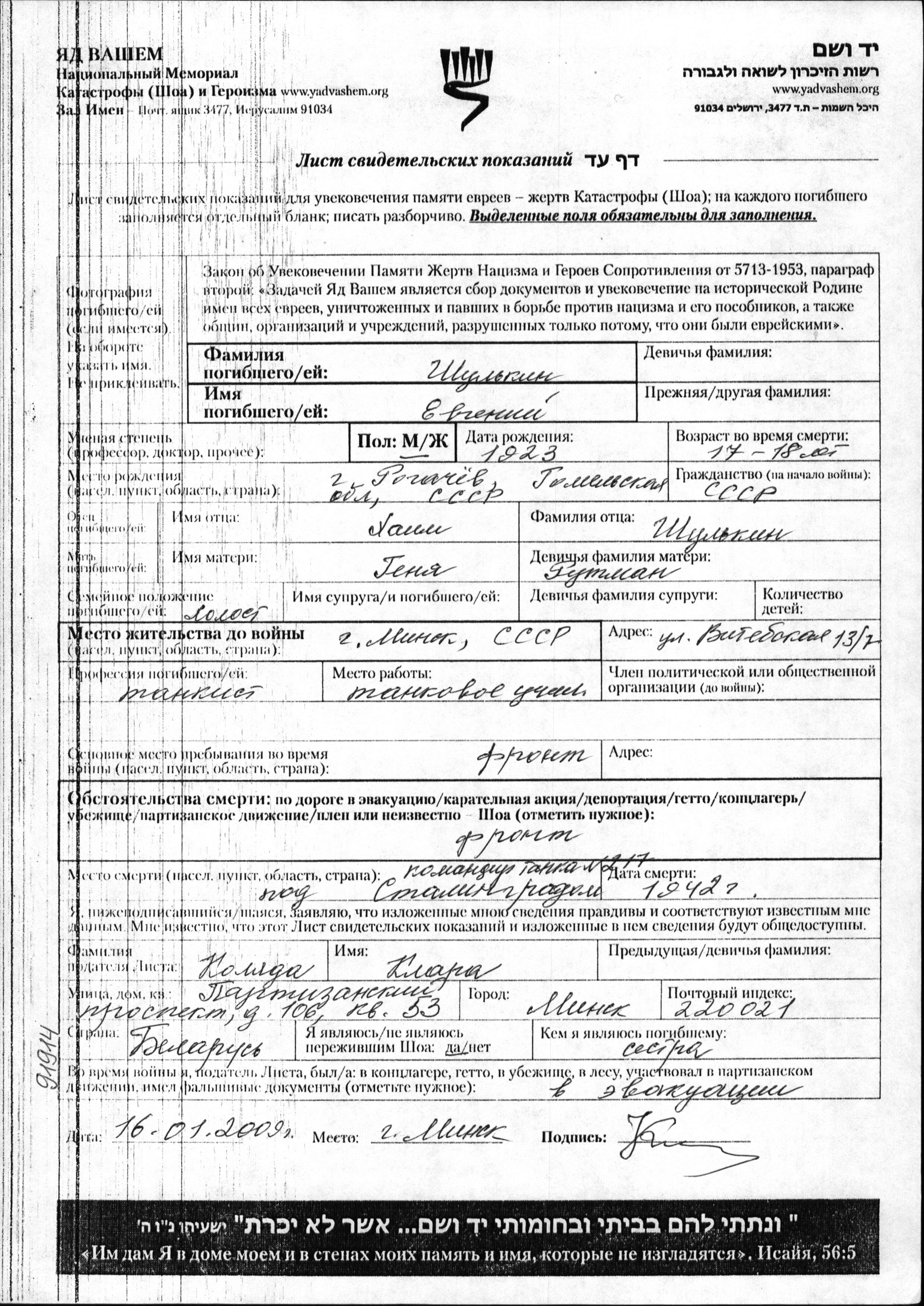 Shulkin Yevgeniy 1923 Minsk, Weißrussland (UdSSR) Gedenkblatt