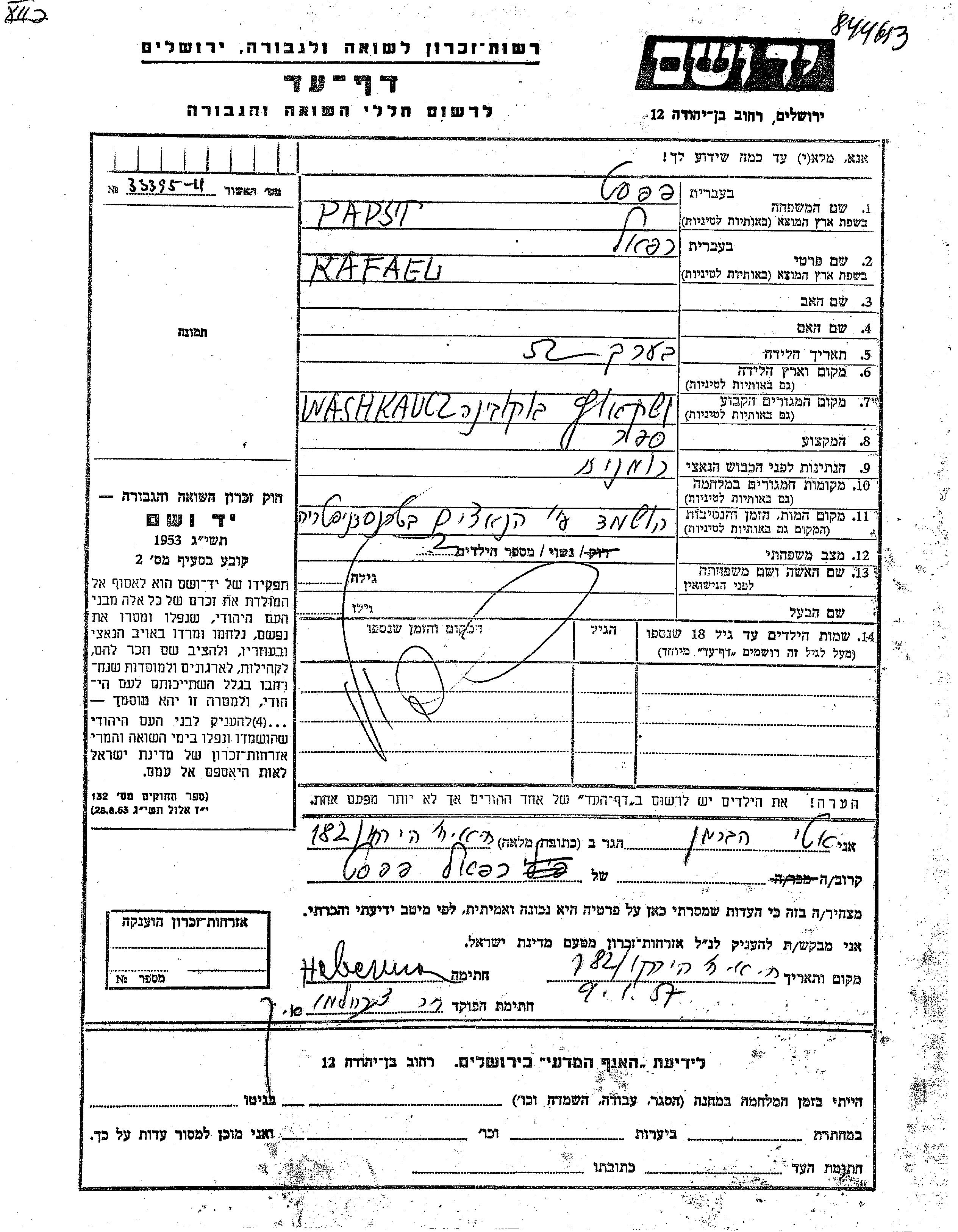 Rafael Papst. Er war Friseur/-in und Verheiratet. Vor dem Zweiten Weltkrieg lebte er in Waschkautz, Rumänien.