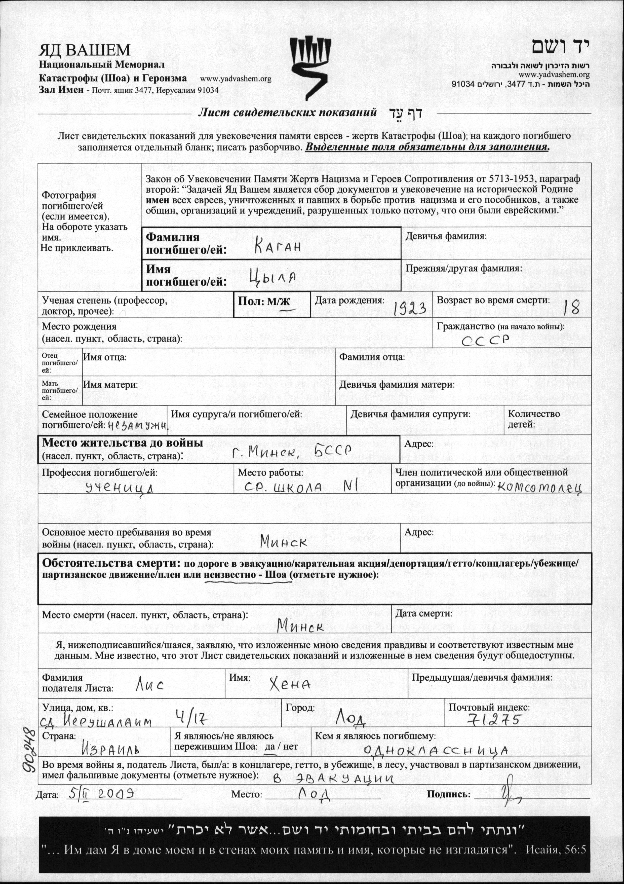 Tzylya Kagan wurde im Jahr 1923 geboren. Sie war Mittelschulabsolvent und Ledig. Vor dem Zweiten Weltkrieg lebte sie in Minsk, Weißrussland (UdSSR). Während des Krieges war sie in Minsk, Weißrussland (UdSSR).