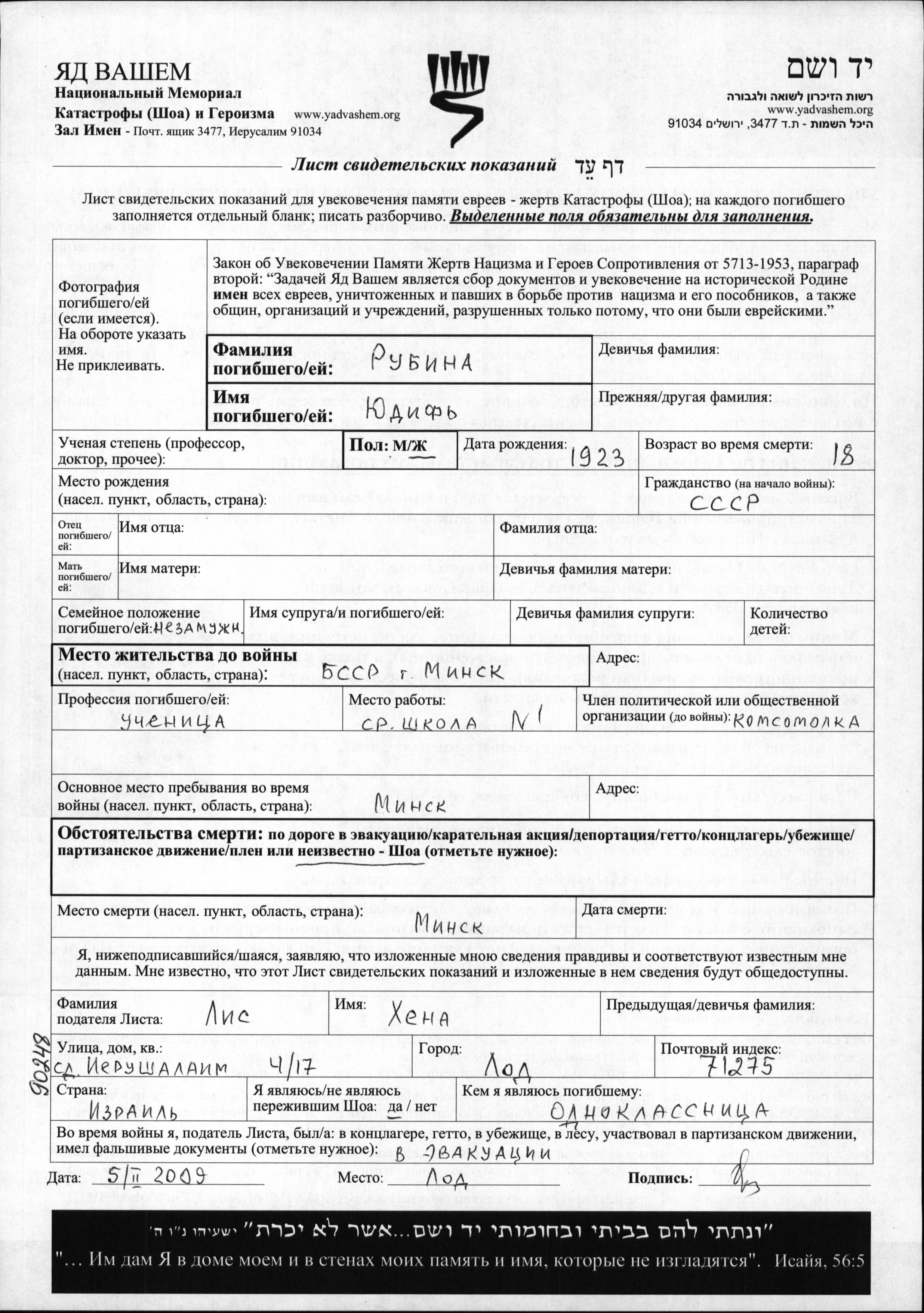 Yudif Rubina wurde im Jahr 1923 geboren. Sie war Schüler/-in und Ledig. Vor dem Zweiten Weltkrieg lebte sie in Minsk, Weißrussland (UdSSR). Während des Krieges war sie in Minsk, Weißrussland (UdSSR).