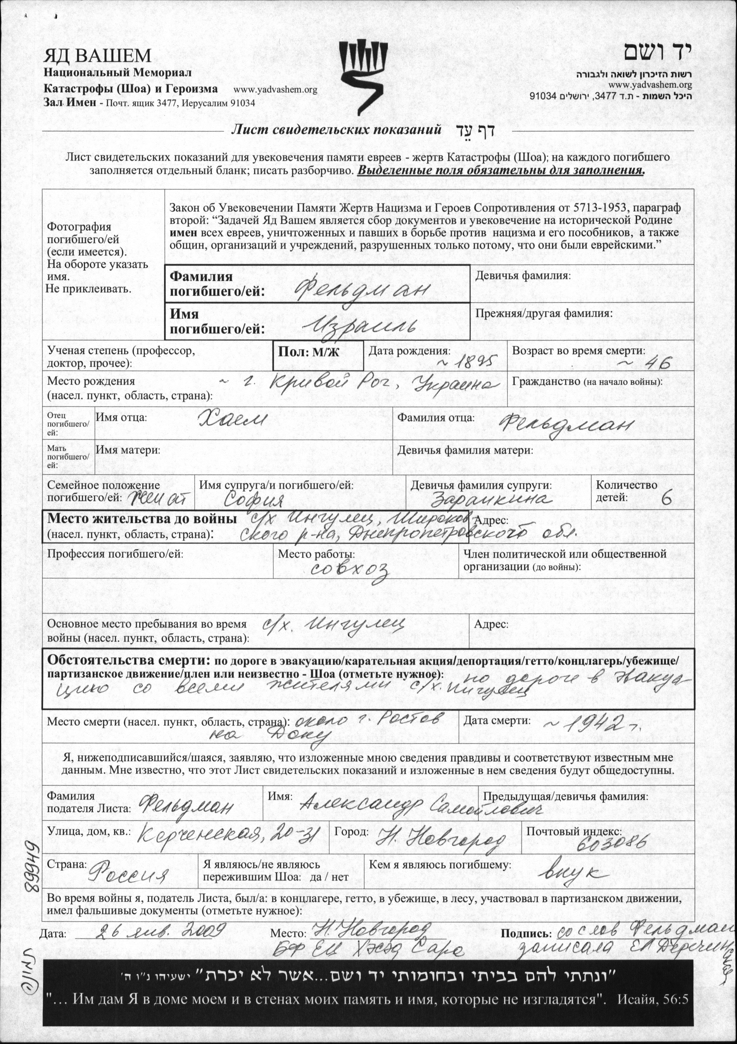 Izrail Feldman wurde im Jahr 1895 in Krivoi Rog, Ukraine (UdSSR) geboren. Er war der Sohn von Khaim. Er war mit Sofiya, geb. Zarankina Verheiratet. Vor dem Zweiten Weltkrieg lebte er in Ingulets, Ukraine (UdSSR). Während des Krieges war er in Ingulets, Ukraine (UdSSR).